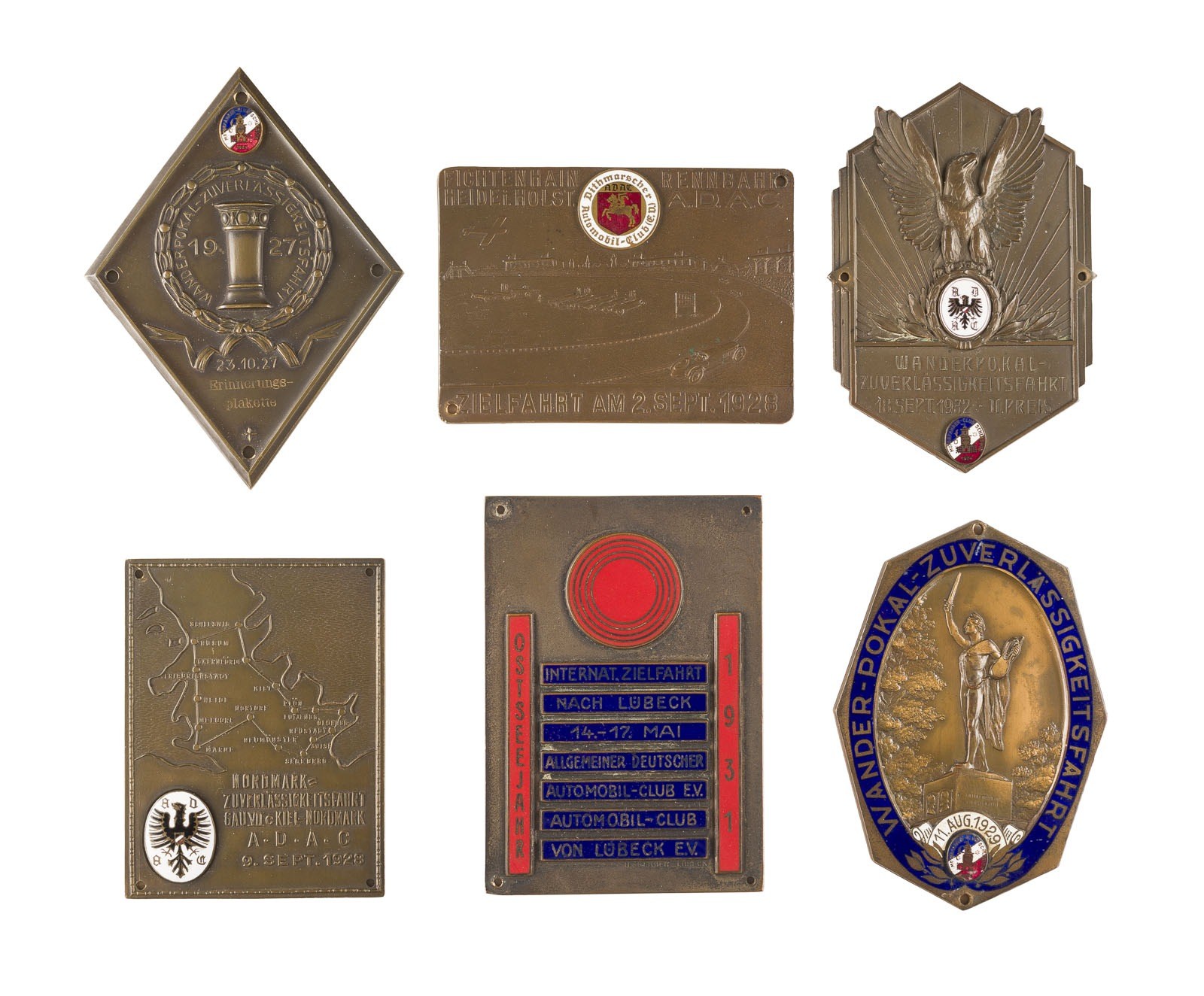 'Zielfahrt am 2. Sept. 1928 - Fichtenhain Rennbahn Heide i. Holst. ADAC - Dithmarscher Automobil-Club'; 'Nordmark-Zuverlässigkeitsfahrt Gau VIIc Kiel-Nordmark ADAC 9. Sept. 1928'; 'Wander-Pokal Zuverlässigkeitsfahrt 11. Aug. 1929 - Motorfahrer-Club Schleswig'; 'Internat. Zielfahrt nach Lübeck 14.-17. Mai Allgemeiner Deutscher Automobil-Club e.V. Ostseejahr 1931'; 'Wanderpokal Zuverlässigkeitsfahrt 18. Sept. 1932 II. Preis Motorfahrer-Club Schleswig'. Part. ber. und best.