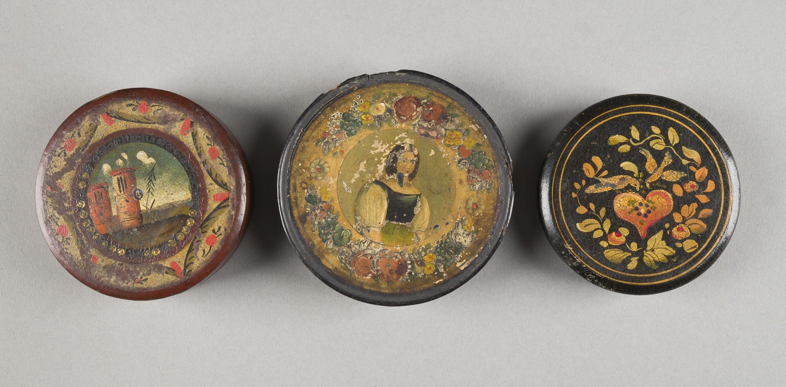 Pappmaché, schwarz lackiert, polychrome Öl-Lackmalerei. H. ca. 2 bis 2,5 cm, D. ca. 7,5 bis 8,5 cm. Drei Dosen mit Steckdeckeln und polychromem Figuren-, Landschafts- und Floraldekor. Part. ber., best. und besch.