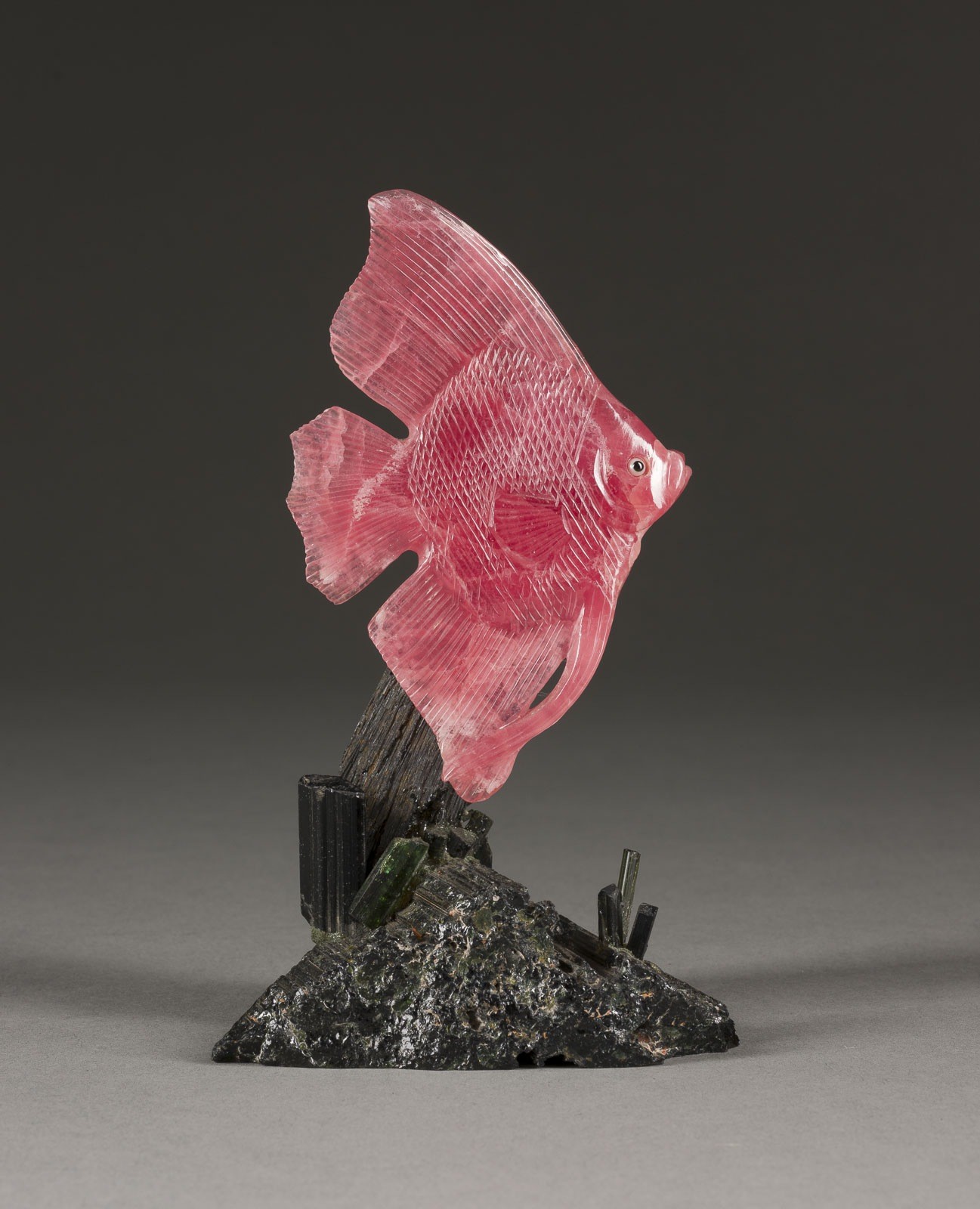 Leicht transparenter Rhodochrosit, grüner Turmalin (Verdelit). 15 x 9 x 6,5 cm. Auf grünlichem Sockel vollplastische, naturalistische Schnitzarbeit mit Darstellung eines