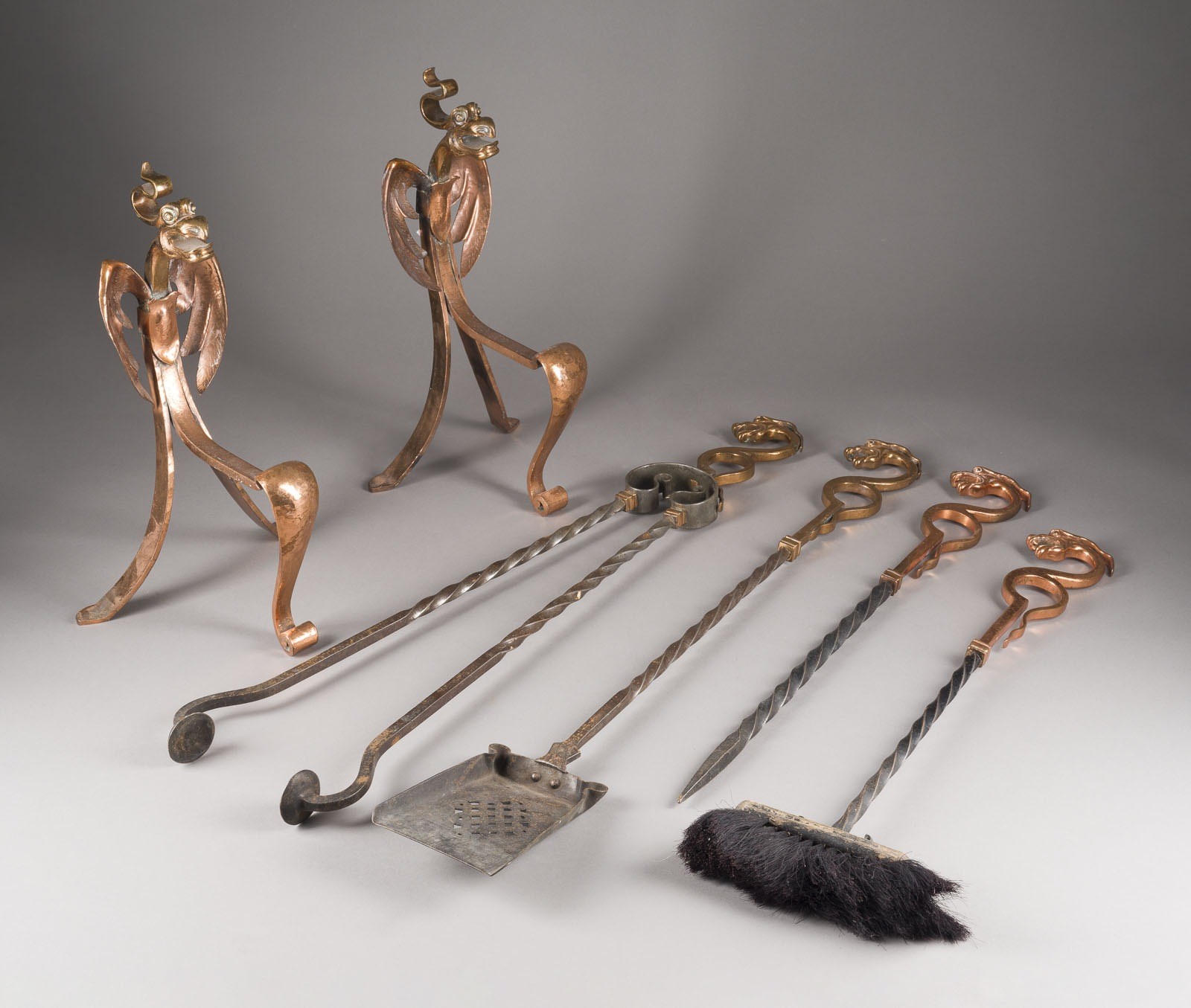 Kupfer, Eisen, geschmiedet. H. ca. 44 cm (Böcke), L. 85, 83, 65, 64 cm (Bestec. 6-tlg.; vierteiliges Kaminbesteck mit Schaufel, Besen, Zange und Schürhaken sowie zwei