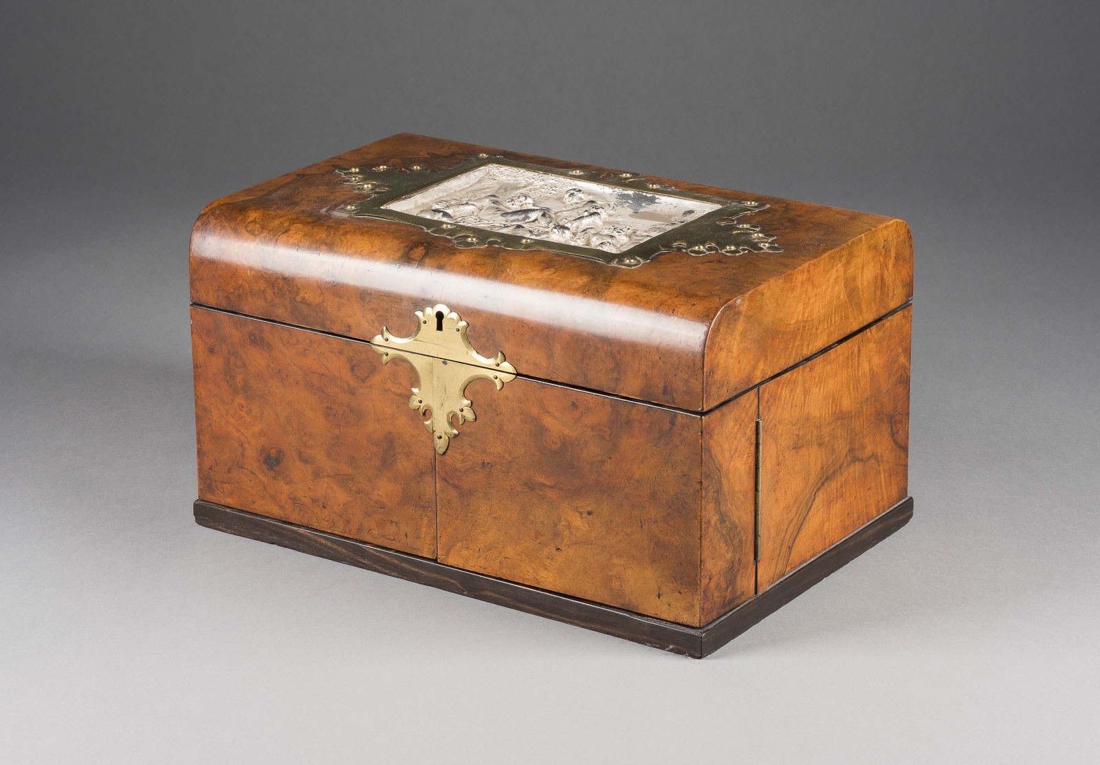 Nussbaum, furniert, Nusswurzelfurnier, part. dunkel patiniert, Messing, Metall, part. silberfarben gefasst, Leder, Bein, part. gefärbt, Papier. 18 x 33 x 22,5 cm. Innen Etikett 'Sold by Richard Wathew 78 Buchanan street Glasgow' sowie rautenförmiger Brandstempel mit Bez. 'Rd. - 29 - H - K - 2'. Truhenförmige Schatulle mit ornamentalen Messingbeschlägen und eingelassenem, figürlichem
