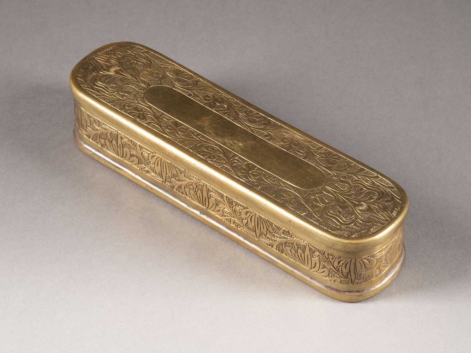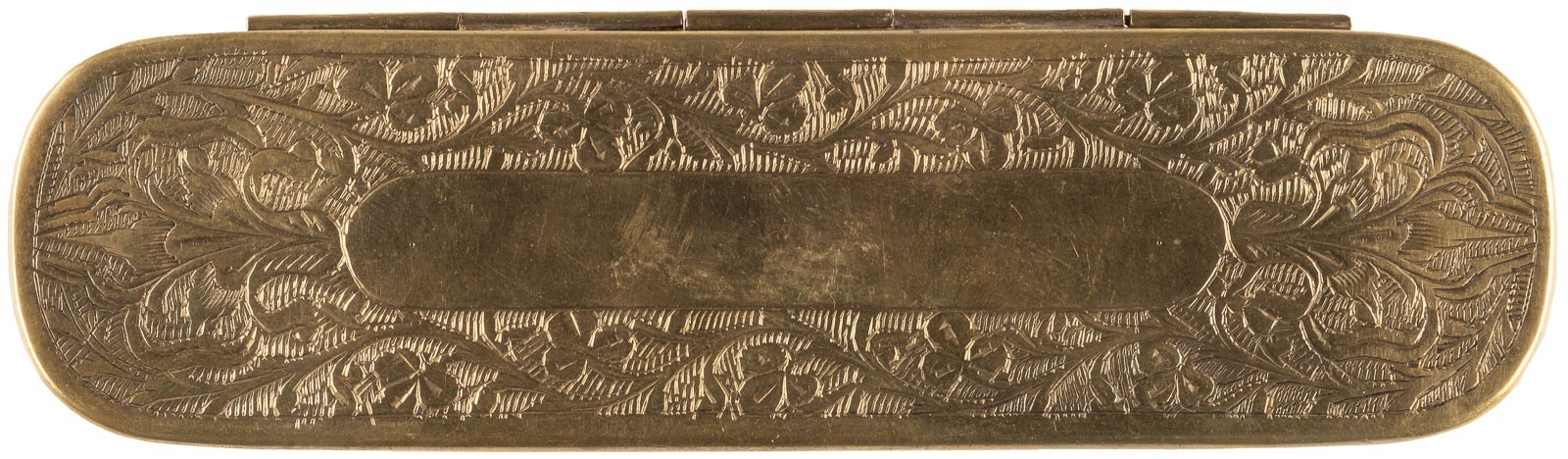 Messing. 16 x 4,5 x 3,5 cm. Längsrechteckige Form mit abgerundeten Enden und scharniertem Deckel. Auf Deckel und