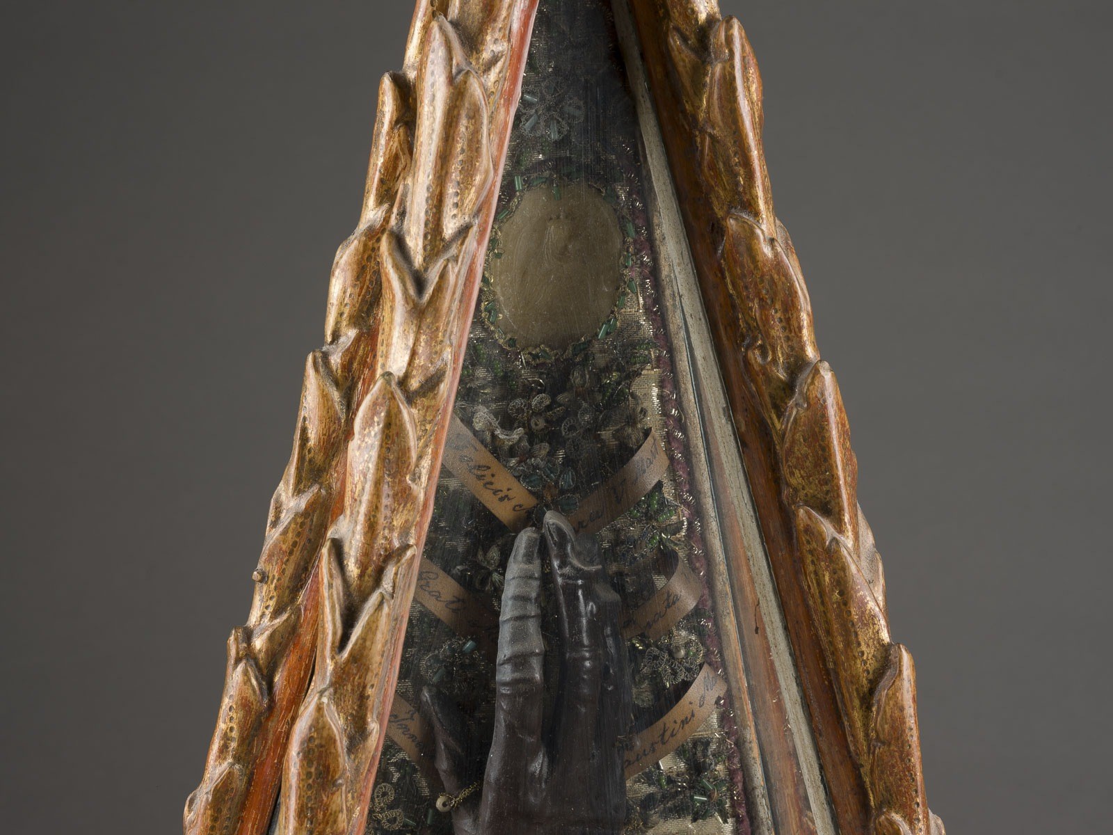 Holz, polychrom gefasst, Glas, Metall, Goldlahn, Wachs, Papier, Eisen. 60 x 28 x 13,5 cm. Klosterarbeit mit Annahand bzw. Kreuzesnagel, umgeben von Metall- und Golddrahtarbeit,