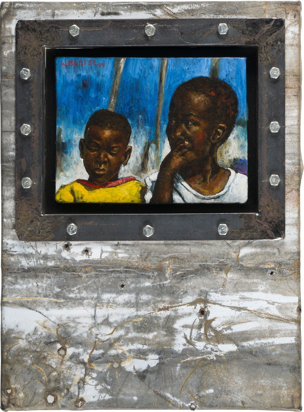 Mischtechnik, Öl auf Leinen auf Platte, Metall. Gesamtmaß 38 x 28 x 2,3 cm. Platte 13,5 x 18 cm. Oben links sign. u. dat. 'WBESTER 99'.