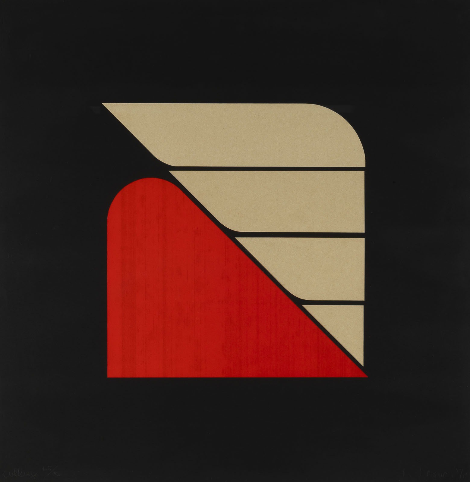 Farbserigrafie, Collage auf schwarzem Karton. SM 59 X 59 cm (R. 61 x 61 x 2 cm). Unten rechts hansigniert und datiert sowie unten links bez. und nummeriert '105/150'. Part. min. fleckig. Hinter Glas gerahmt (ungeöffnet).