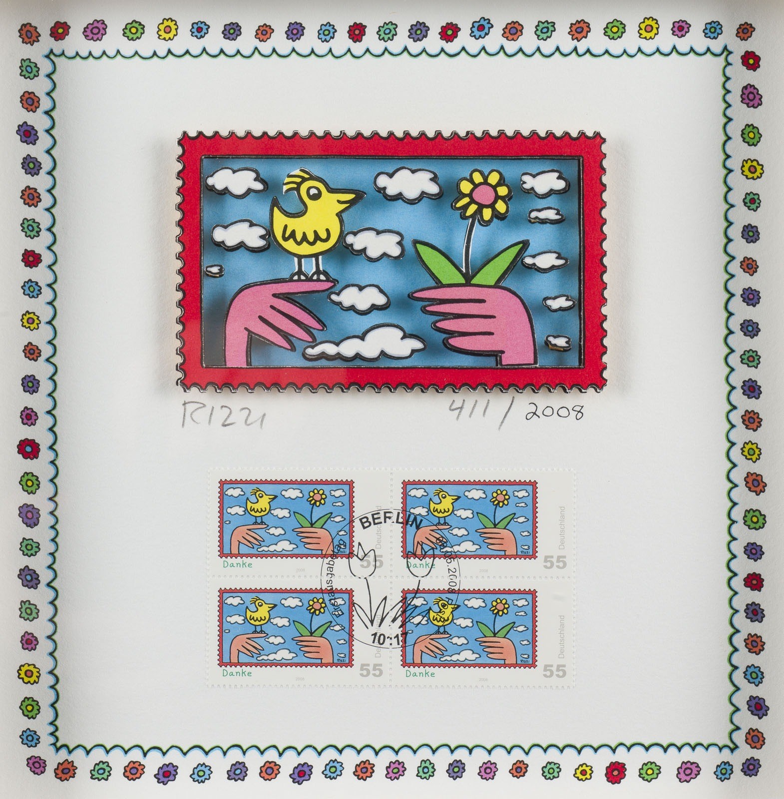 3-D-Grafik, darunter 4 Briefmarken mit Ersttagsstempel. R 31,3 x 31,3 cm. SM 20 x 20 cm. Unten links mit Bleistift signiert sowie unten rechts num. '411/2008'. Hinter Glas gerahmt (ungeöffnet).