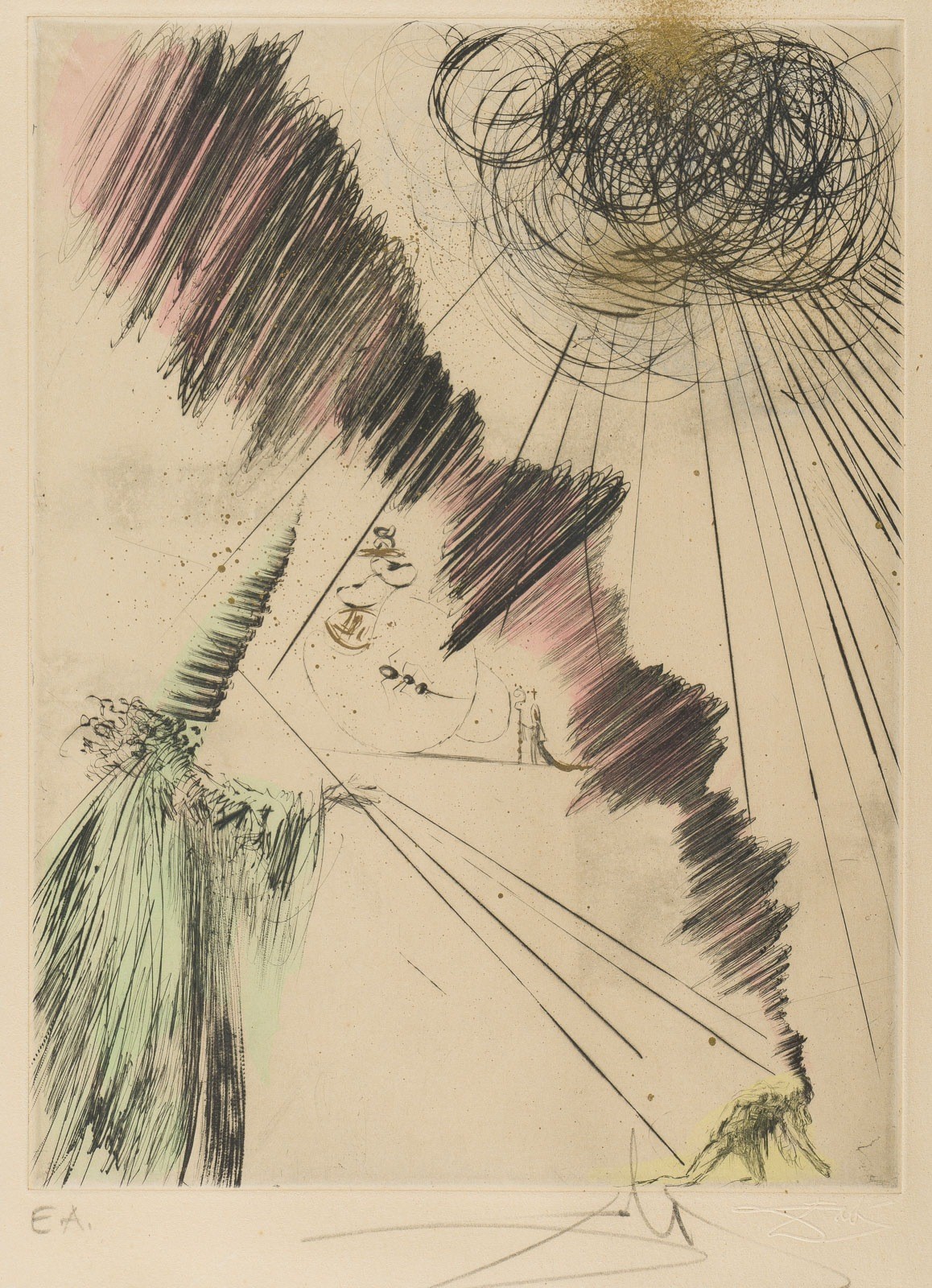 Kolorierte Kaltnadel- und Rouletteradierung mit Goldauflage auf Arches teinté. R 56 x 46 cm. SM 35,4 x 25,4 cm. DM 31,7 x 23,6 cm. Unten rechts mit Bleistift sign. sowie mit Trockenstempel. Unten links bez. 'E.A.'. Part. minimalst fleckig. Im Passepartout und hinter Glas gerahmt (ungeöffnet).