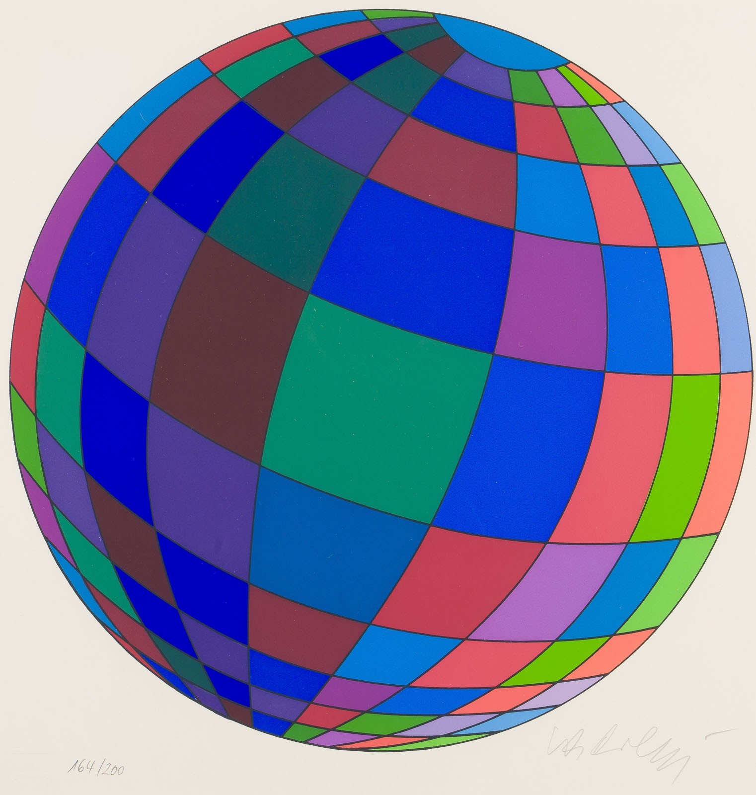 Serigrafie auf leichtem Karton, mit Trockenstempel 'Studio Bruckmann'. R 47,2 x 46,2 cm. BM 23,8 x 22,8 cm. DM 22 cm. Unten rechts mit Bleistift sign. 'Vasarely', unten links num. '164/200'. Im Passepartout und hinter Glas gerahmt (ungeöffnet).