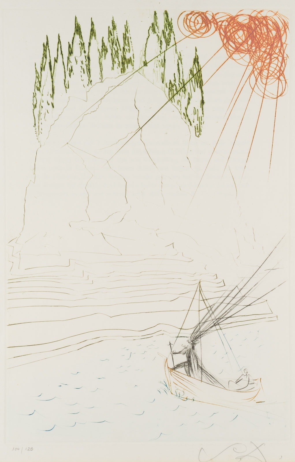 Farbkaltnadelradierung auf BFK Rives, mit Wasserzeichen u. Trockenstempel, Doppelbogen des Buchs. BM (gefaltet) 69,5 x 32,5 cm. DM 40 x 26,5 cm. Unten rechts mit Bleistift sign. sowie unten links mit Ex.-Nr. '104/125'. Verso: Rückseitig mit Text von André Mary, mit Bleistift von fremder Hand bez. sowie mit Resten alter Montage auf der rechten Seite. Min. lichtrandig, Passepartout mit Griffspuren. Im Passepartout umlaufend montiert.