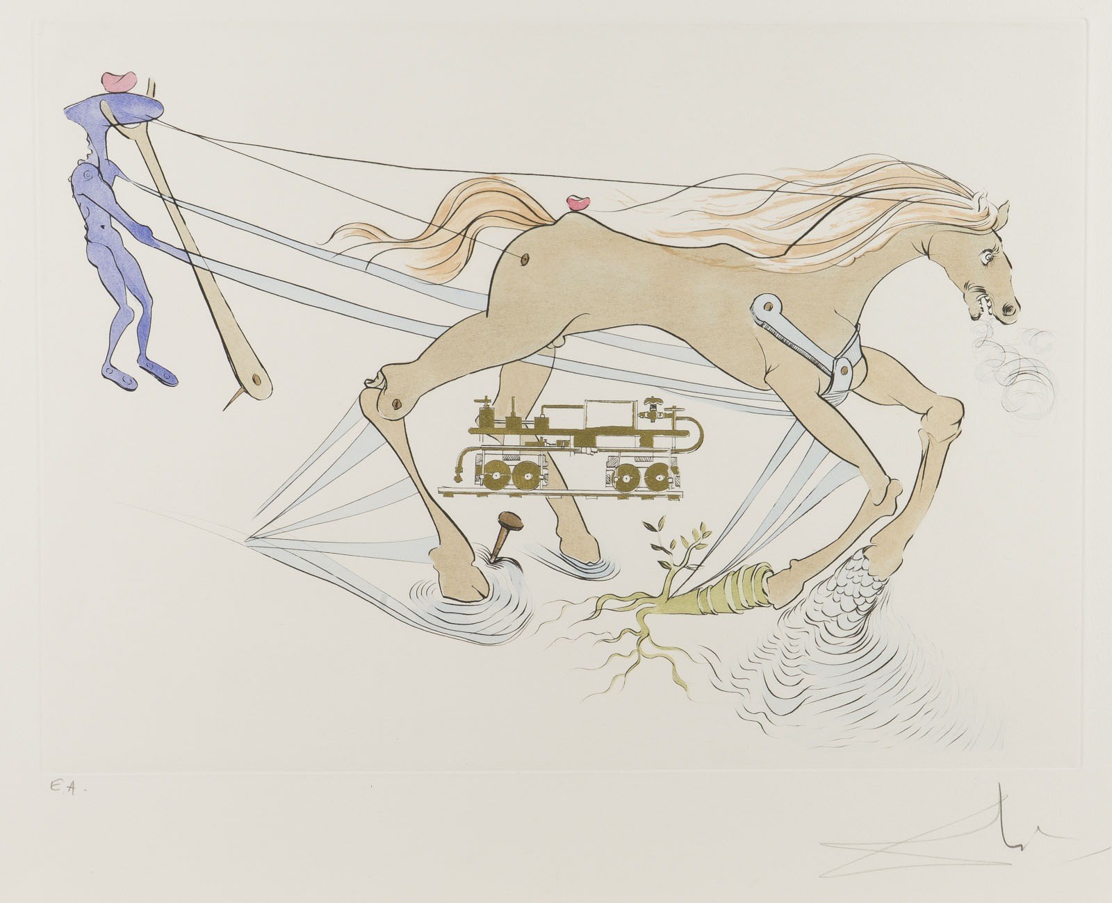 Farbradierung mit Pochoir und Goldauflage auf Arches, mit Wasserzeichen. BM 56,5 x 76,2 cm. DM 36,5 x 50,7 cm. Unten rechts mit Bleistift sign. 'Dalí' sowie unten links bez. 'E.A.'. Part. min. Griffspuren sowie part. im Randbereich part. fleckig. Ungerahmt.