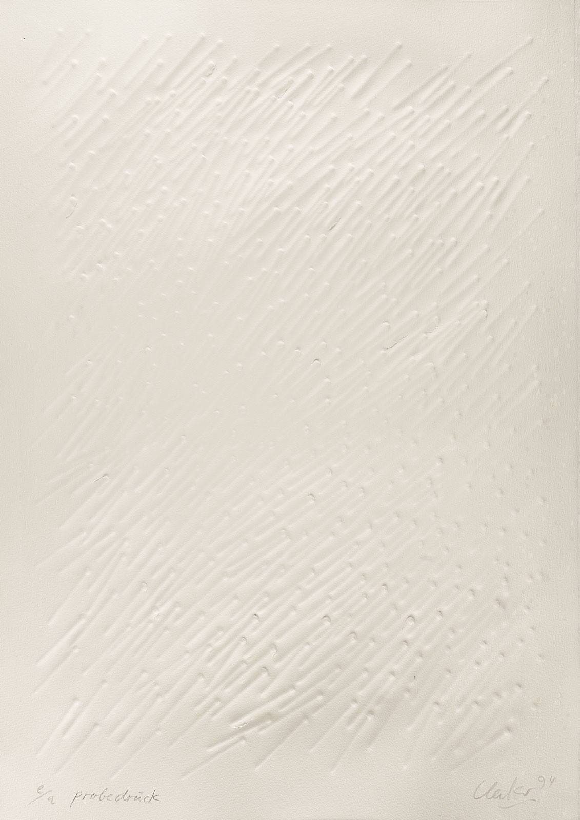 Prägedruck auf Bütten. R 94,6 x 75,3 cm. BM 69,4 x 49,8 cm. Unten rechts mit Bleistift sign. u. dat. 'Uecker (19)94' sowie unten links bez. 'e/a probedruck'. Herstellungsbedingt leicht gewellt. Auf grauem Hintergrund montiert und im Passepartout sowie hinter Glas gerahmt (ungeöffnet).