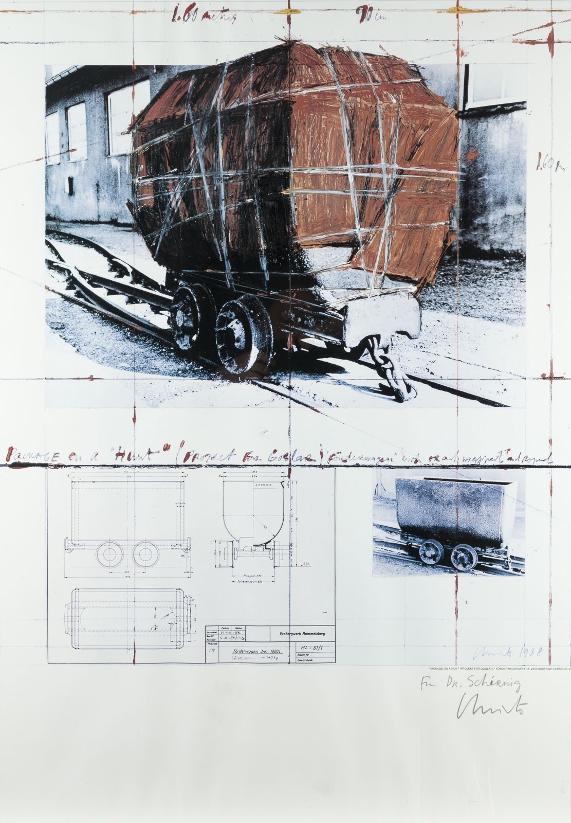 Farboffset auf Papier. SM 99,5 x 69,5 cm (R. 101 x 71 x 2,5 cm). Unten rechts handsigniert 'Christo' sowie gewidmet 'Für Dr. Schirnig'. Verso: Guter Zustand. Hinter Glas gerahmt (ungeöffnet).