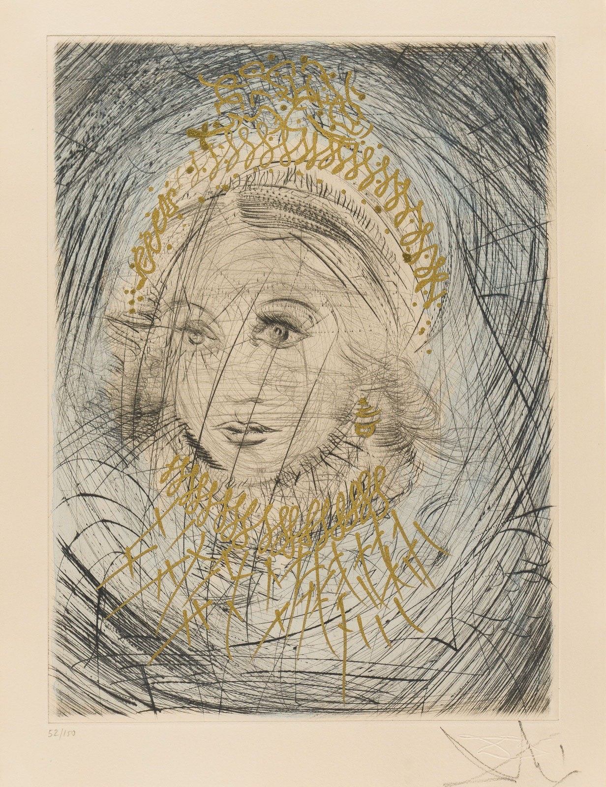Kolorierte Kaltnadel- und Rouletteradierung auf Arches teinté, mit Wasserzeichen. R 70,7 x 59,5 cm. BM 37,5 x 28,3 cm. DM 31,6 x 23,6 cm. Unten rechts mit Stempelsignatur und handsigniert mit Bleistift 'Dalí' sowie unten links mit Ex.-Nr. '52/150'. Verso: Rückseitig auf dem Rahmen mit Klebeetikett 'Kunsthandlung de Bernardi'. Im Passepartout montiert und hinter Glas gerahmt (ungeöffnet).