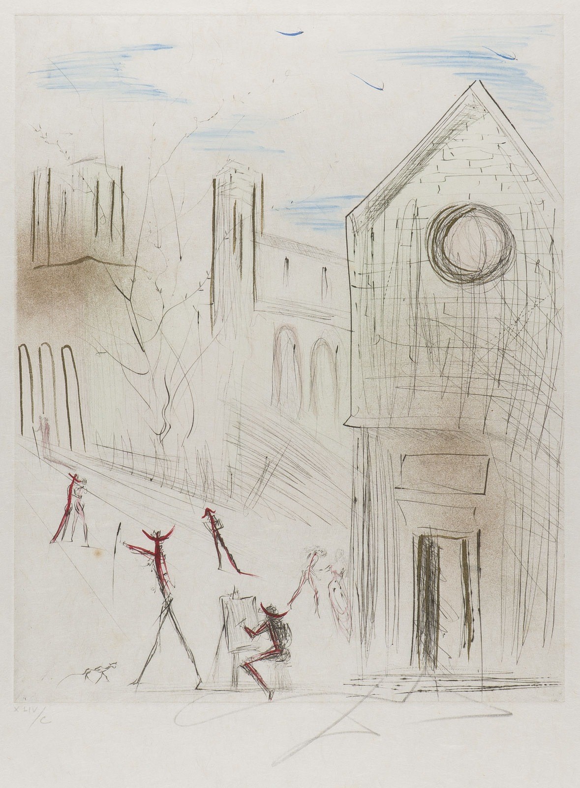 Kolorierte Kaltnadelradierung auf Japan, mit Trockenstempel 'Dalí'. R 85,3 x 71,5 cm. BM 65,1 x 51 cm. DM 39,5 x 31,8 cm. Unten rechts mit Bleistift sign. 'Dalí' sowie unten links mit Ex.-Nr. 'XLIV/C'. Part. min. gebräunt sowie stockfleckig. Im Passepartout montiert und hinter Glas gerahmt (ungeöffnet).