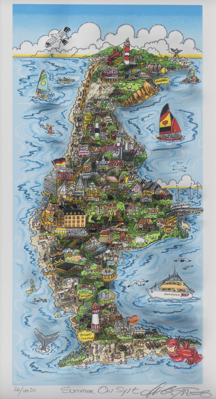 Mischtechnik mit 3D-Farbserigrafie auf weißem Museumspapier. R 69 x 47 cm. DM ca. 41 x 20 cm. Unten rechts mit Bleistift sign., mittig betitelt sowie unten links mit Ex.-Nr. '26/100DX'. Im abgestuften Passepartout und hinter Glas gerahmt (ungeöffnet).