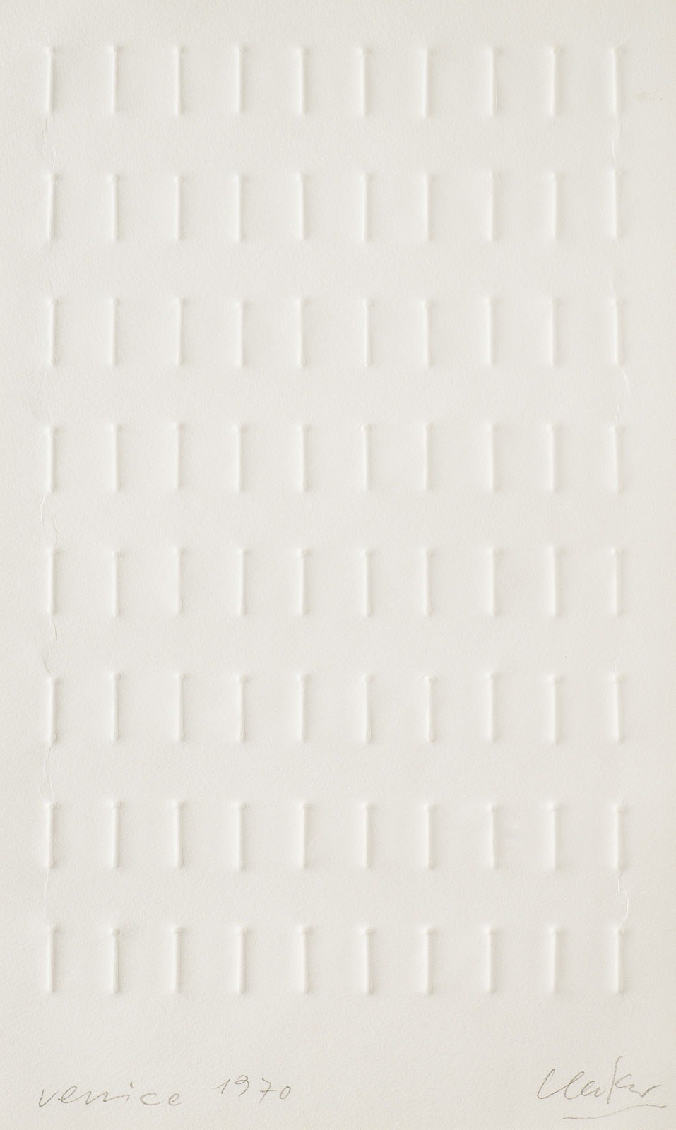 Prägedruck auf Papier. R 54 x 40 cm. BM 36,2 x 21,8 cm. Unten rechts mit Bleistift sign. sowie unten links dat. und betitelt. Part. minimalst fleckig. In Passepartout montiert und hinter Glas gerahmt (ungeöffnet).