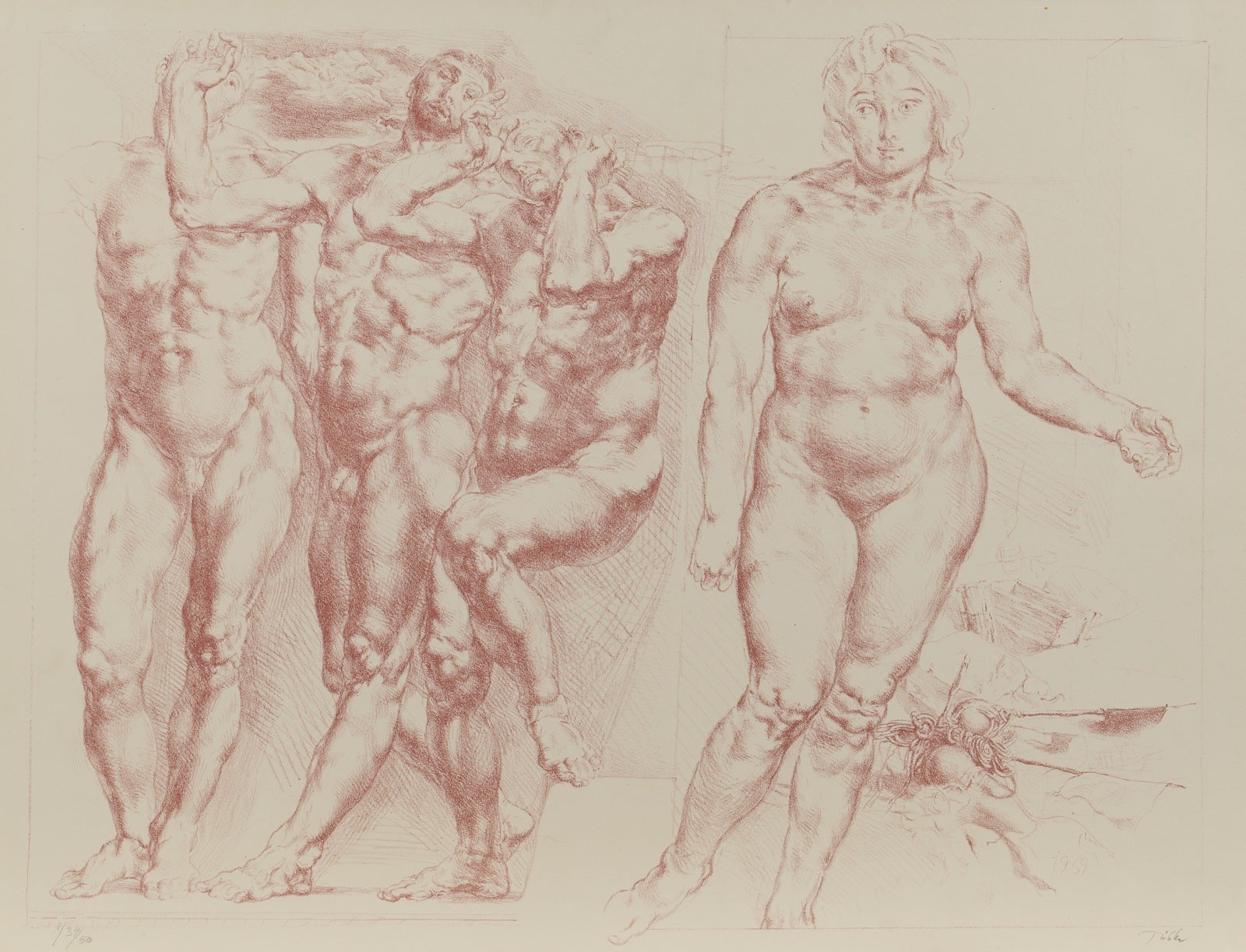 Kreidelithografie in Rötelton auf festem getöntem Velin. BM 36 x 48 cm. DM 34,2 x 43,6 cm. Unten rechts im Druck dat. '1969' sowie unterhalb der Darstellung in Bleistift handsign. 'Tübke' rechts und mit Ex.-Nr. '1/34/50' links. Verso: Mit alten Montagespuren. Part. minimalst stockfleckig u. gebräunt. Ungerahmt.