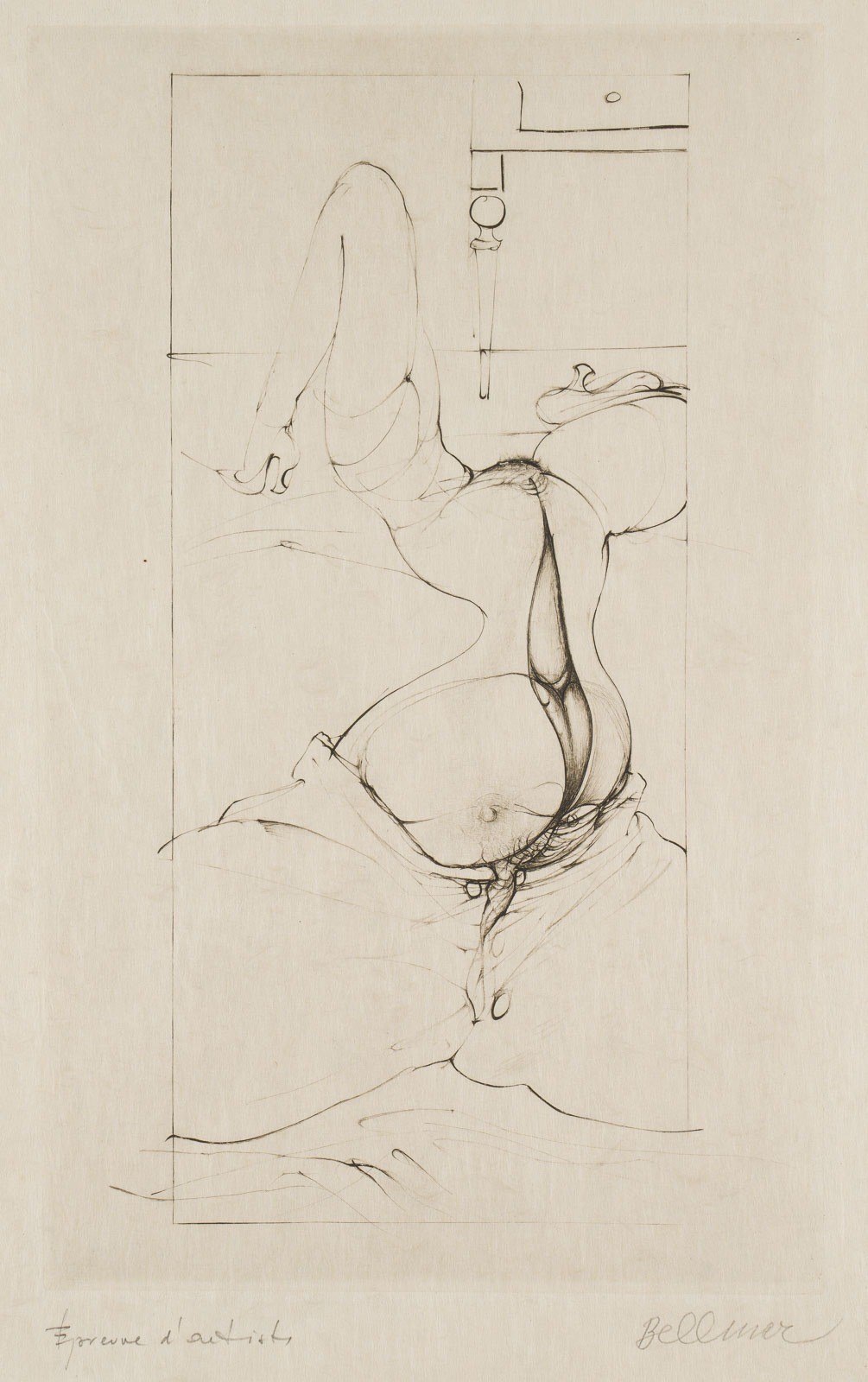 Radierung auf Japan. BM 67,5 x 50,5 cm. DM 28,8 x 17,8 cm. Unten rechts mit Bleistift sign. 'Bellmer' sowie unten links bez. 'Epreuve d'artiste'. Verso: Von fremder Hand mit Bleistift bez. Leichte Griffspuren bzw. mit kleiner Knickspur. Ungerahmt.