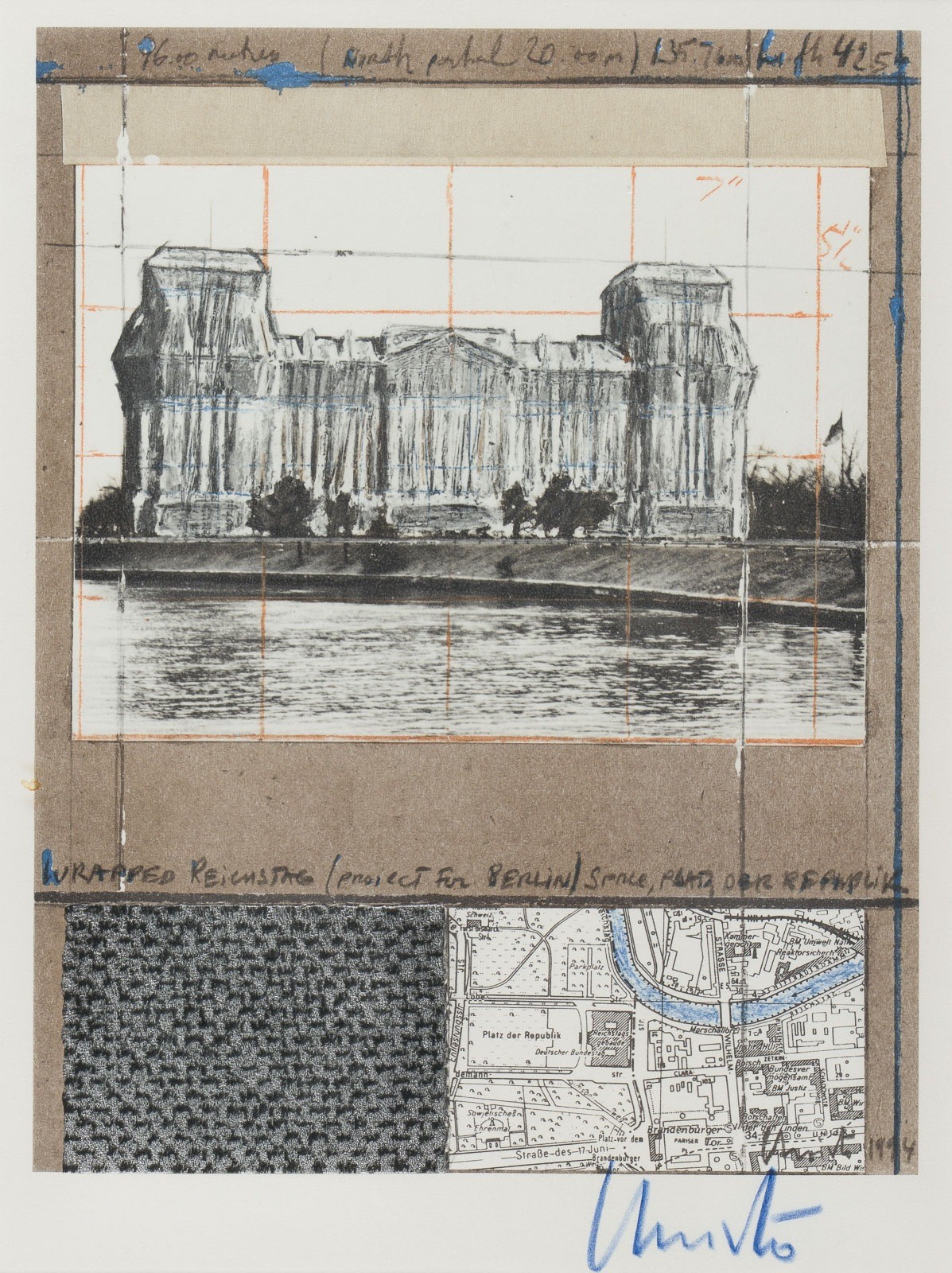 Fototypie und Serigrafie auf Papier. R 41 x 31 cm. SM 31,2 x 23,3 cm. DM 27,6 x 21,4 cm. Unterhalb der Darstellung rechts mit Farbstift sign. 'Christo' sowie unten rechts im Druck sign. u. dat. Im Passepartout und hinter Glas gerahmt (ungeöffnet).