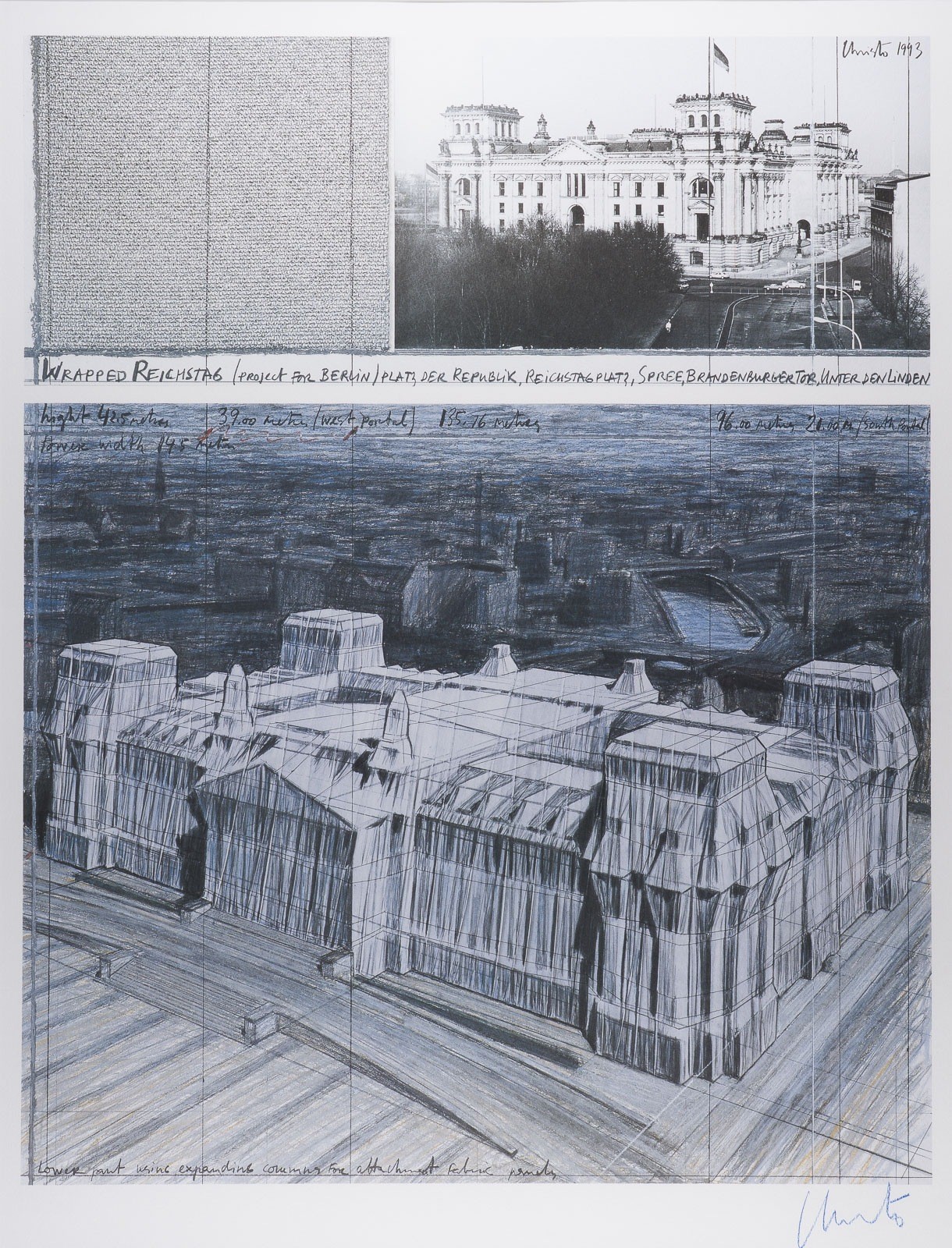 Farboffset auf festem Papier. R 109 x 88,5 cm. DM 77,8 x 61,7 cm. Unten rechts mit blauem Fettstift handsign. 'Christo' sowie oben rechts im Druck sign. u. dat. Im Passepartout und hinter Glas gerahmt (ungeöffnet).
