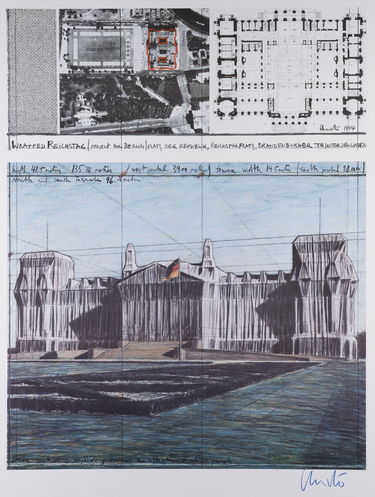 Farboffset auf festem Papier. BM 100 x 69,8 cm. DM 80,7 x 62,9 cm. Unten rechts handsigniert 'Christo'. Part. min. fleckig u. mit Griffspuren, die Ecken min. best.
