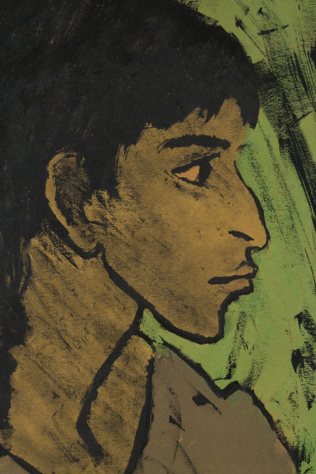 Die 1927 entstandene Serie, die Otto Mueller selbst unter dem Titel "Zigeuner" veröffentlichte, gilt als Höhepunkt seines Spätwerks. Das hier vorliegende Blatt "Zigeunerin im Profil" zählt zu den eindrucksvollsten und zugleich charakteristischsten Darstellungen dieser Folge. In sanft gerundeten Formen und gedämpfter, erdiger Farbgebung zeigt Mueller die Figur einer jungen Frau im Profil - ruhig, gesammelt und in sich gekehrt. Die harmonische Linienführung und die subtile Tonabstufung verleihen dem Werk jene stille Intensität, die Muellers Arbeiten von der expressiven Schärfe seiner "Brücke"-Kollegen unterscheidet.