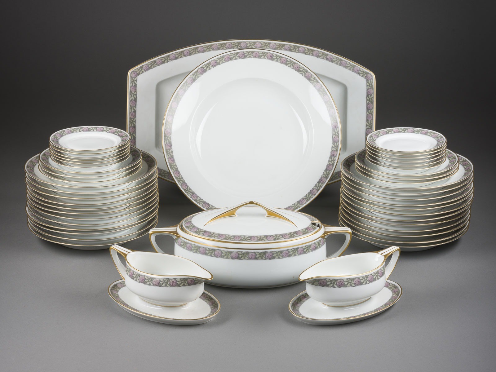 Porzellan, polychromes Aufglasurdekor, Goldstaffage. L. 37-51 cm (Platte), D. 35 cm (Teller). Grüner Manufakturstempel, Pinselnummer, part. 'DONATELLO'. Bestehend aus: 3 Terrinen, 24 Speisetellern, 12 Vorspeisetellern, 12 Brottellern, 12 Suppentellern, 2 Saucieren, 2 Schälchen, 4 quadratischen Schüsseln, 4 Platten und 1 runder Platte. Gold part. ber.