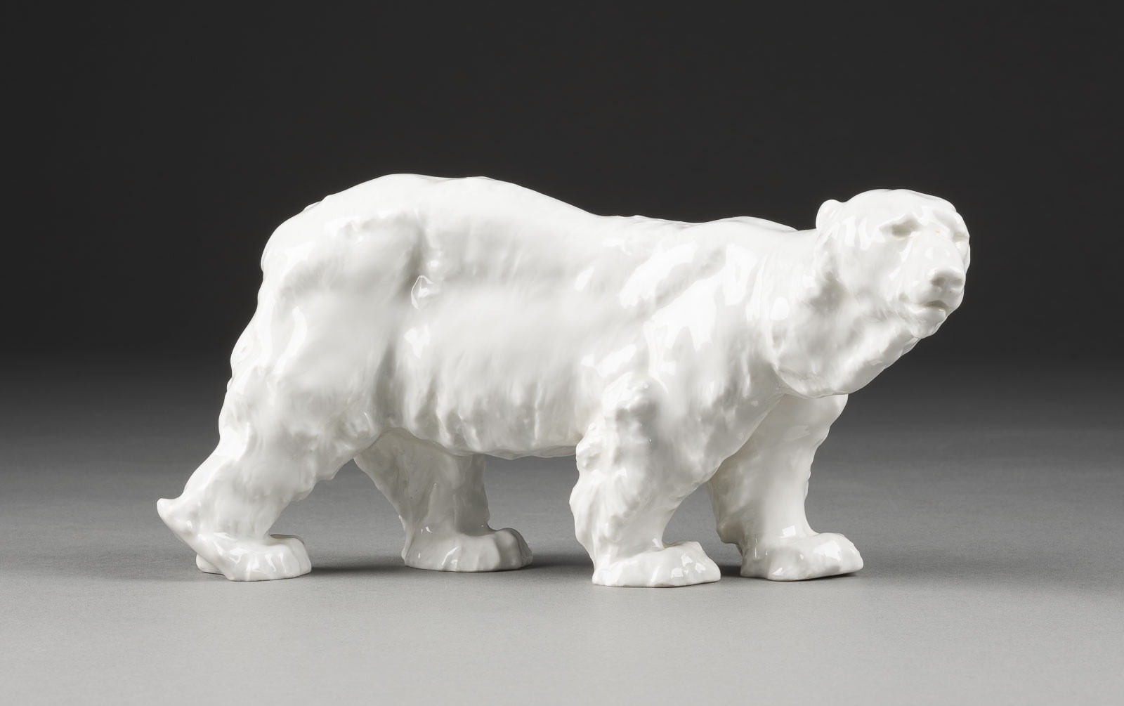 Weißporzellan, glasiert. H. 10,5 cm, L. c. 22,5 cm. Unterglasurblaue Schwertermarke, Weißzeichen, Pressnummer, Jahreszeichen, Modellnr, 'T 182'. 1. Wahl. An einer Pfote min. best.