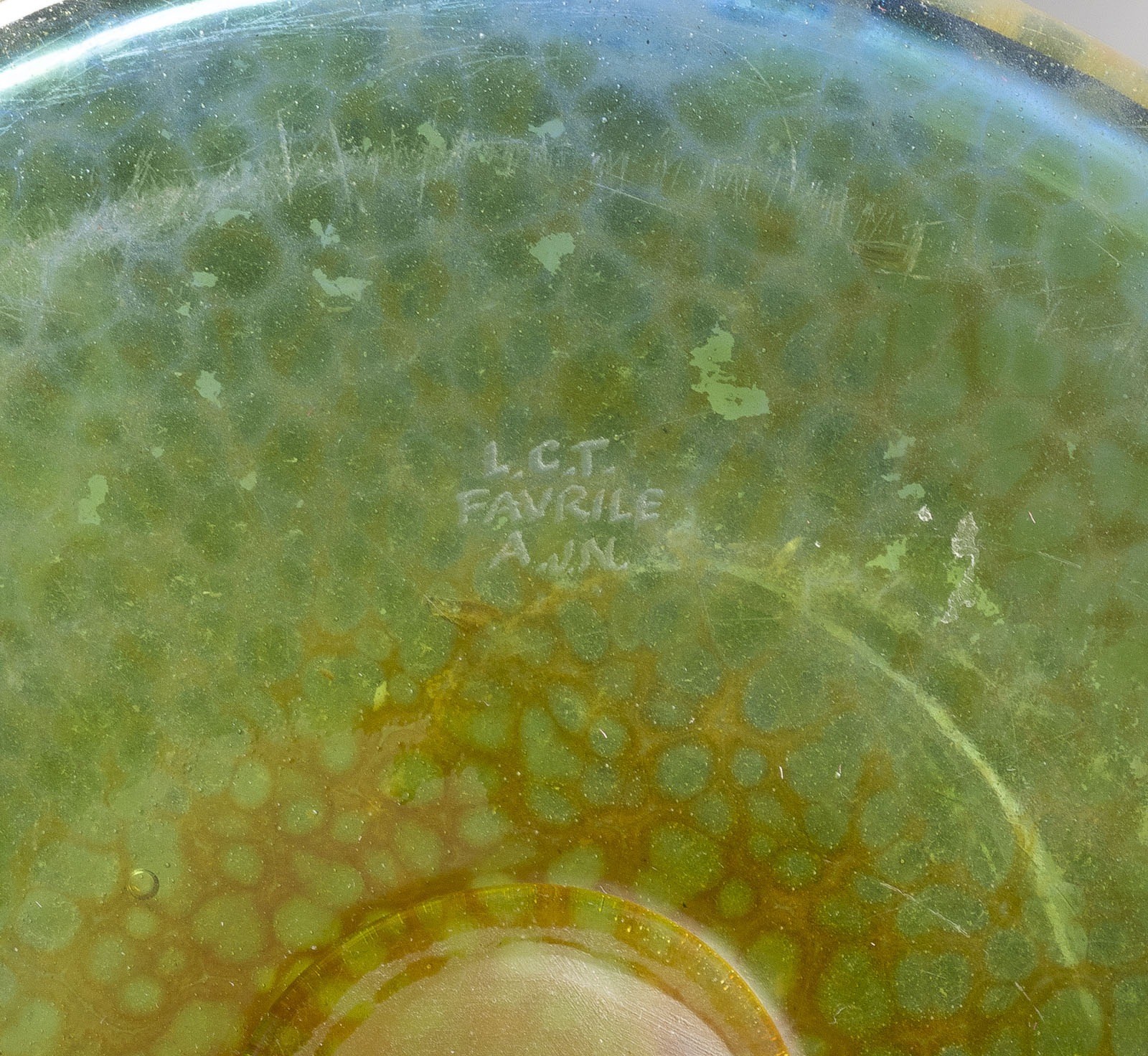 Irisiertes grün-bläuliches 'Favrile'-Glas, gezogene braune Pulvereinschmelzungen. 42,5x25x18 cm. Auf Bodenunterseite bez. 'L.C.T.', 'Favrile' sowie 'A.J.N.' (graviert).