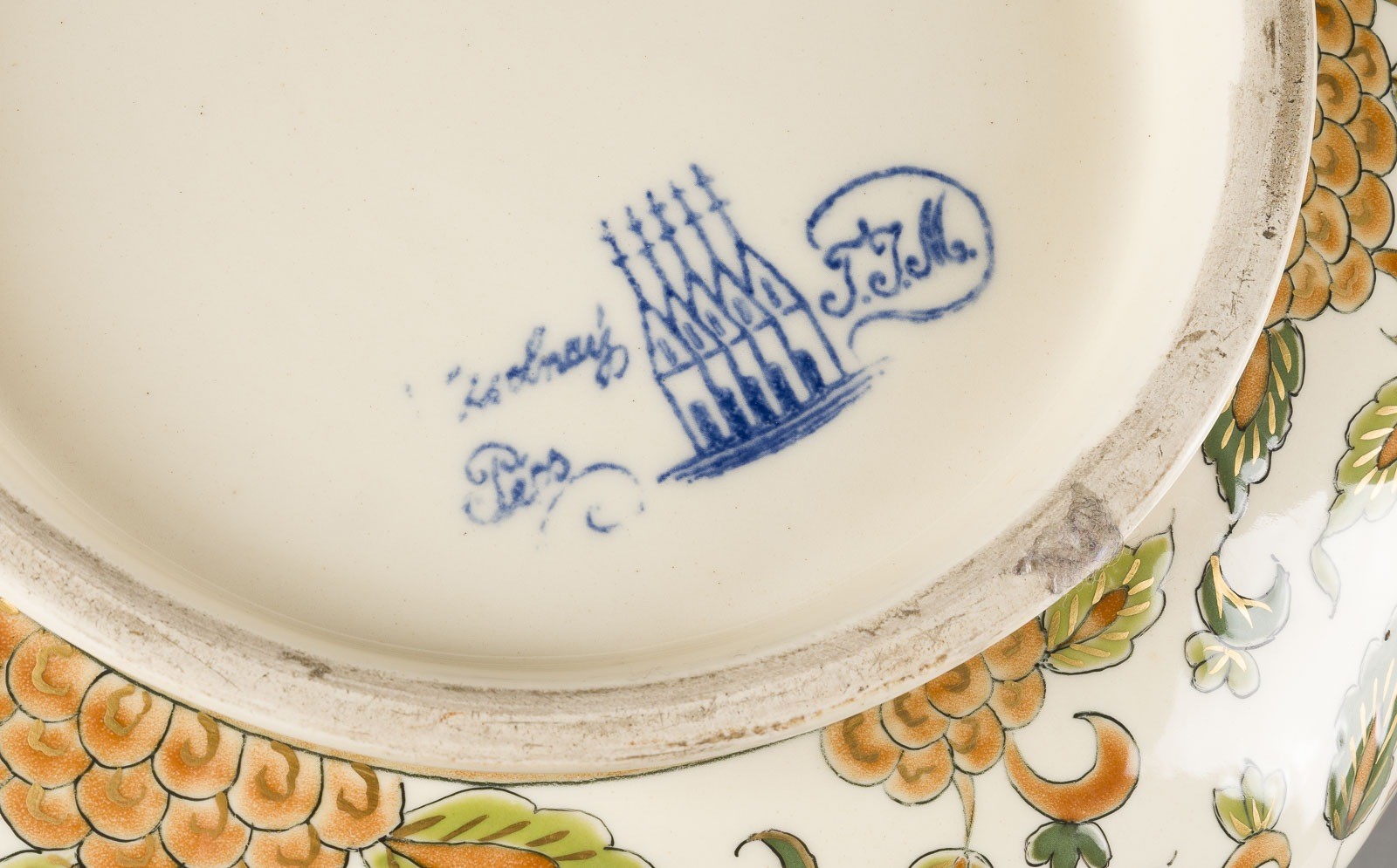 Keramik, polychrome Malerei, Goldstaffage. H. 26,5 cm. Unterglasurblaue Fünfkirchen-Marke mit 'T. J. M.', Modellnr. '621', 'ZW PECS' (undeutlich).