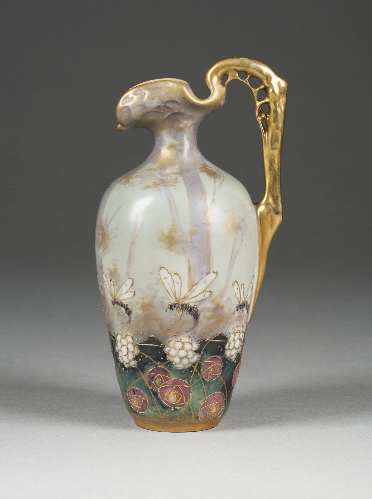 Porzellan, polychrome Malerei, Goldstaffage. H. 18,5 cm. Rote Markierung 'Turn-Teplitz-Bohemia / RStK / Made in Austria', eingeprägte Markierung 'Amphora', 'Austria' sowie eingeprägte Kronenmarkierung, '605?', '41'. Gold min. ber.