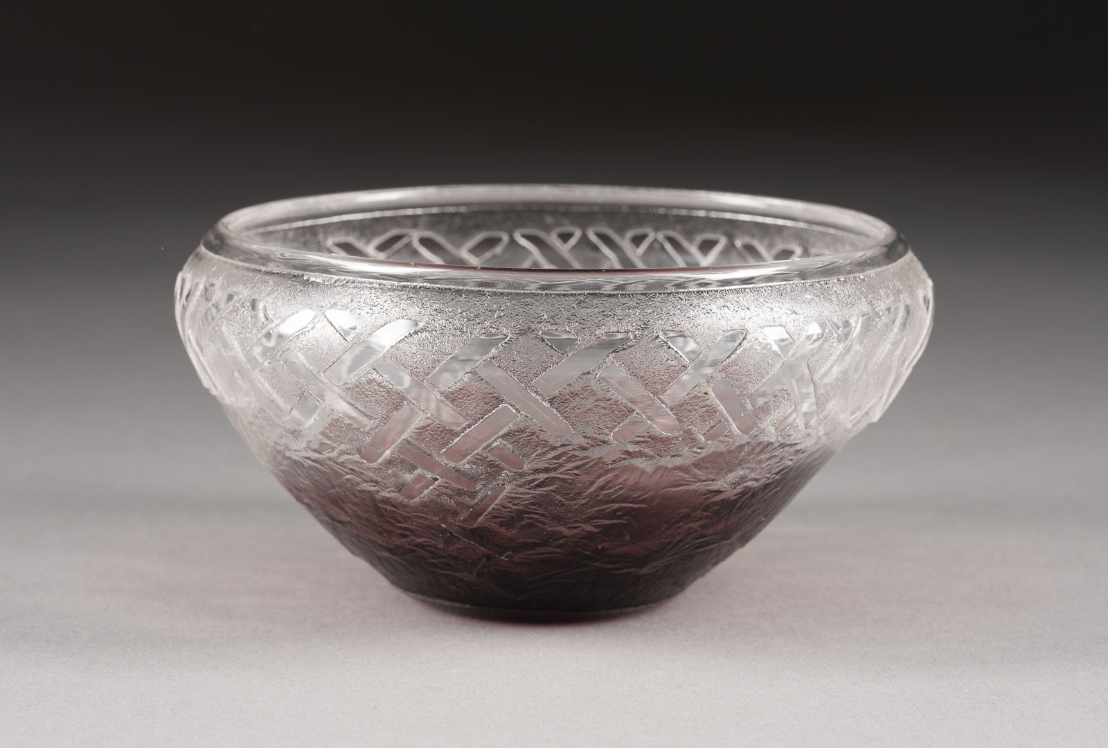 Farbloses und weinrotes Glas, Ätzdekor. D. 11,5 cm. Im Boden Ätzsignatur. An einer Stelle minimalst best.