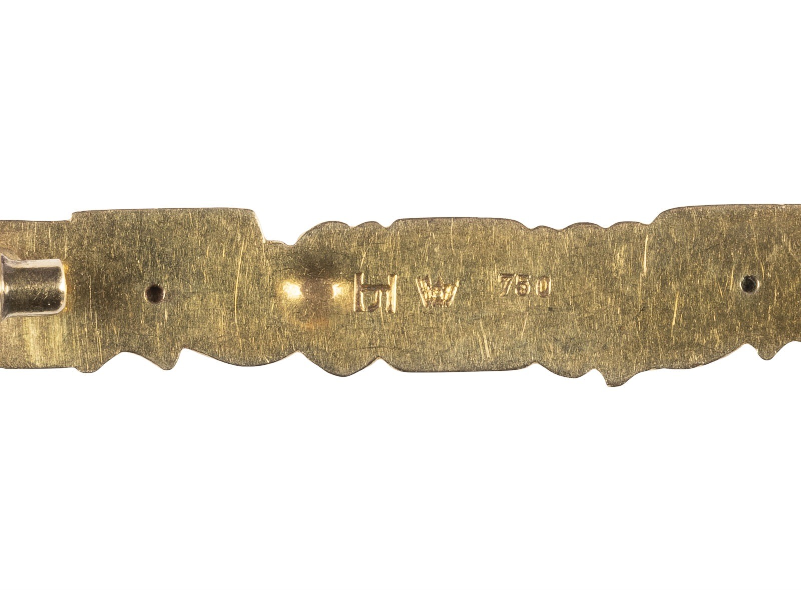 Gold, leicht marteliert. L. 4 cm. Gepunzt Künstlermonogramm, Marke der Wiener Werkstätten, Feingehaltsmarke '750'. Nadel min. gebogen.