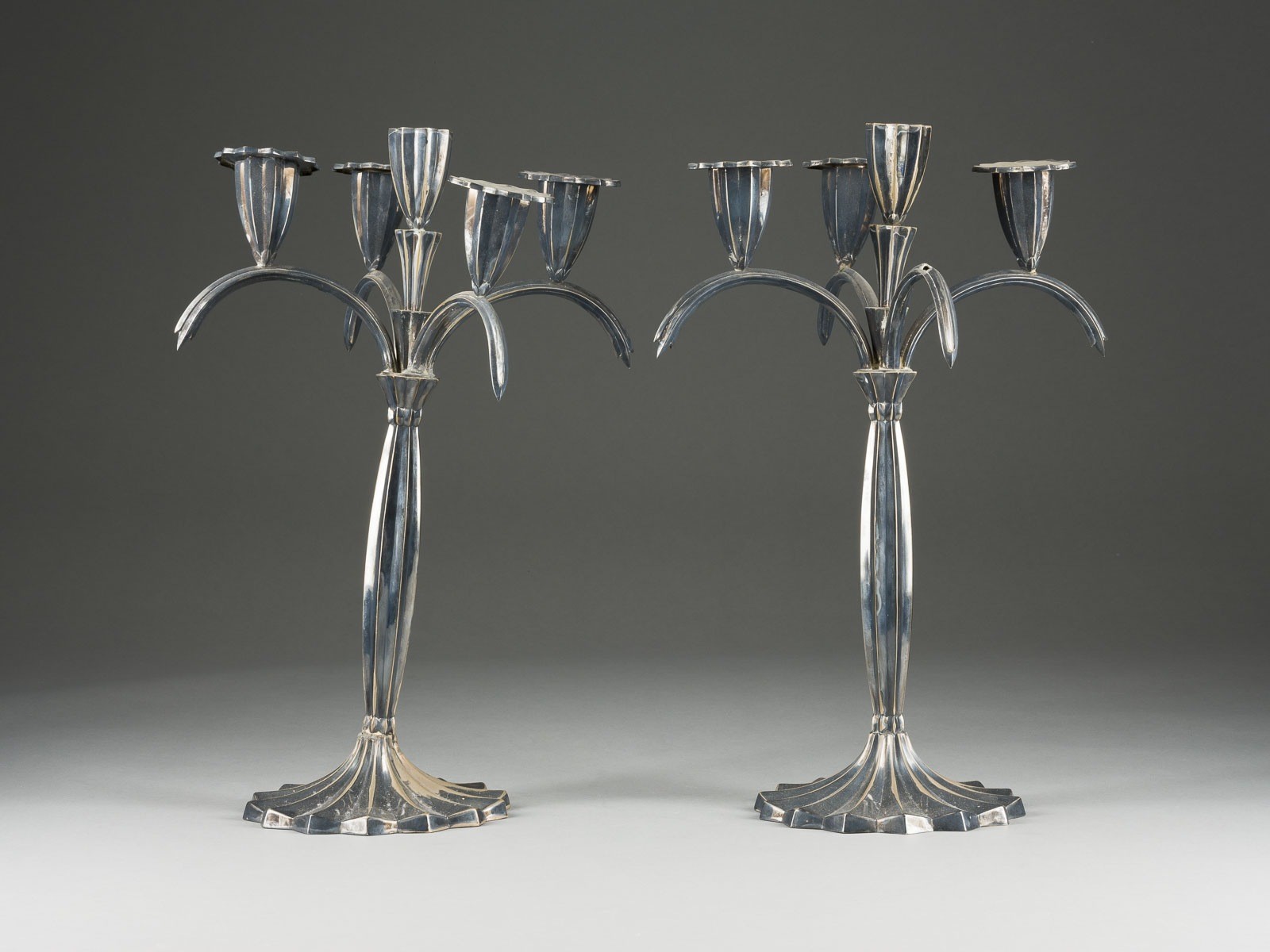 800er Silber, gefüllt. H. 38,5 B. 26,8 cm. Jew. punziert mit Halbmond und Krone sowie Herstellermarke und Feingehalt '800'. Montierung eines Armes gelöst, teils gedellt, eine Kerzenhalterung fehlt, zwei mit fehlender Kerzentülle, ein Kerzenleuchter mit Riss im Stand.