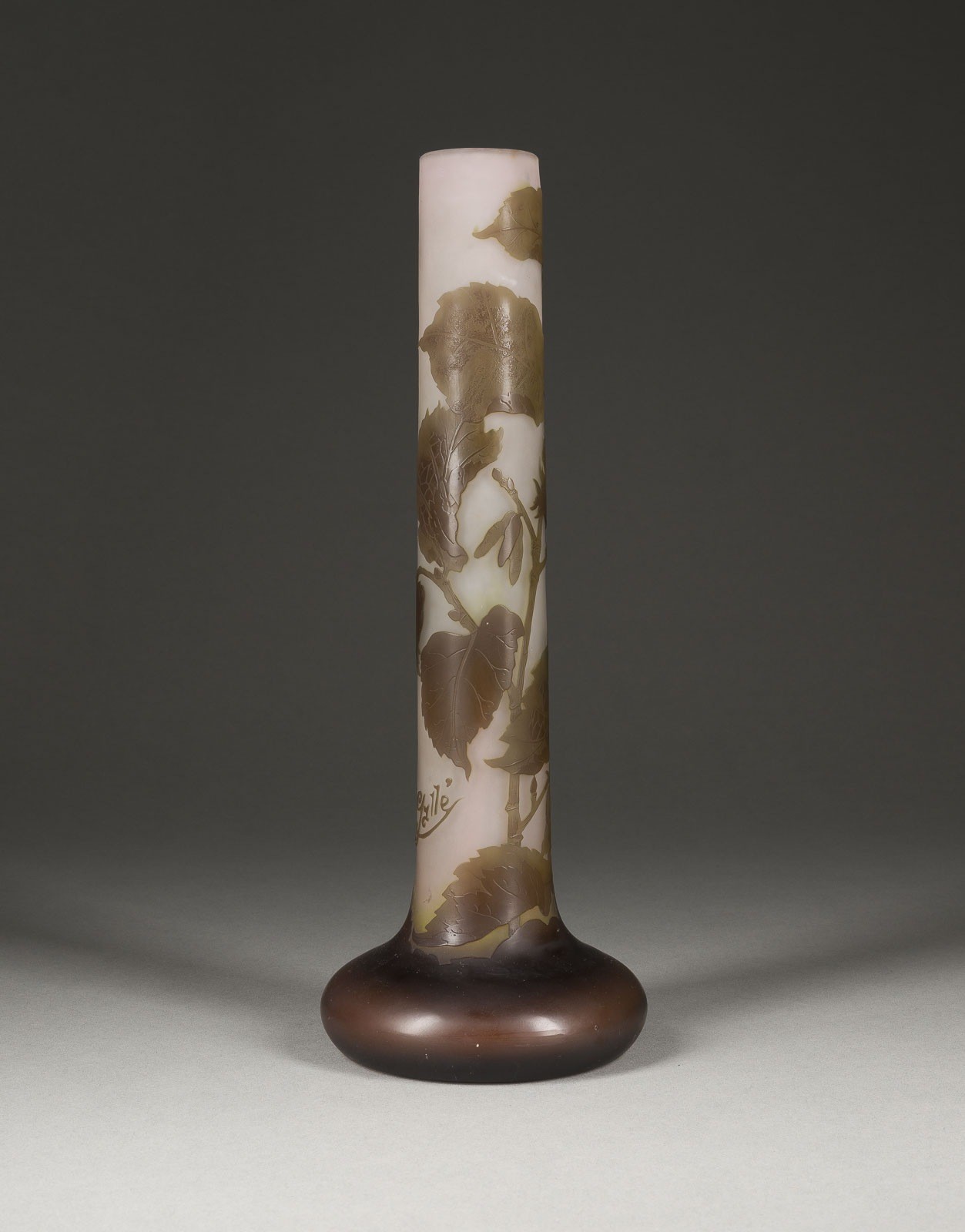 Farbloses Glas, brauner Überfang, rosafarbener Unterfang, Ätzdekor. H. 34 cm. Auf Wandung hochgeätzte Signatur 'Gallé'.