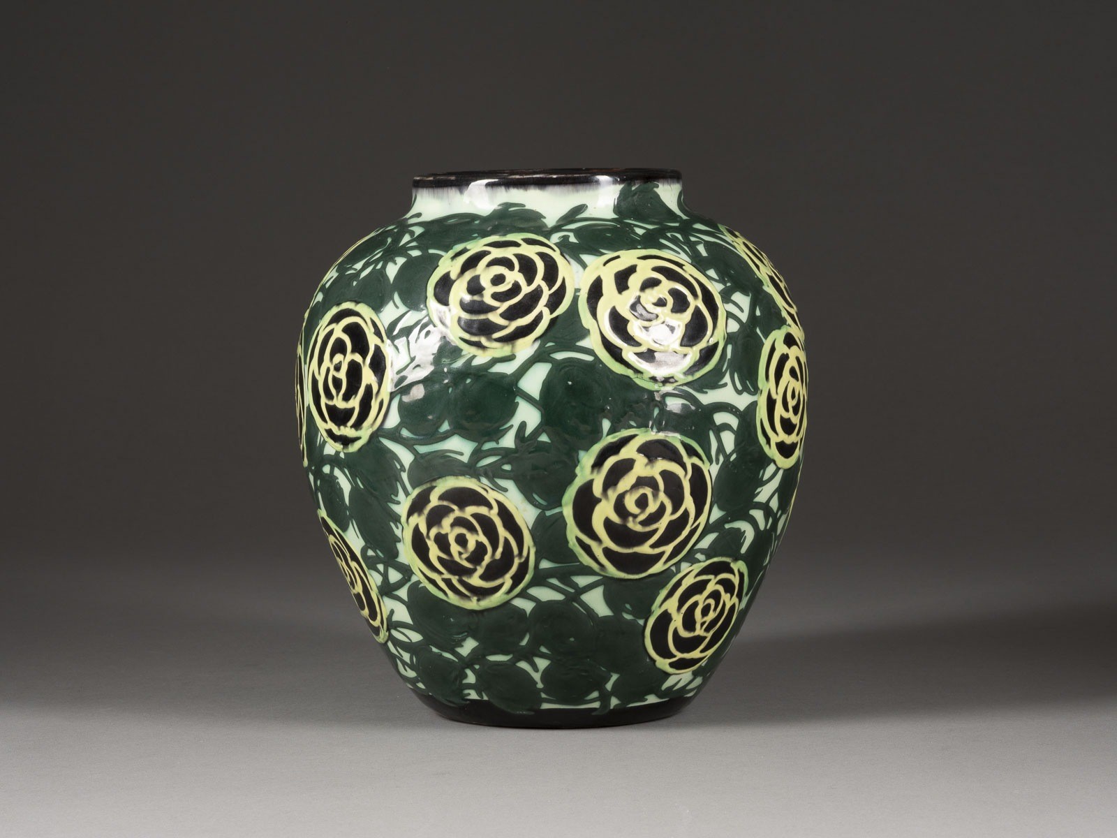 Keramik, rötlicher Scherben, grüner Fond, Schlickermalerei in Grün und Gelb. H. 24 cm. Im Boden Prägemarke mit 'GESETZL GESCHZT' sowie 'v', Modellnr. '469' sowie 'a' (eingeritzt).