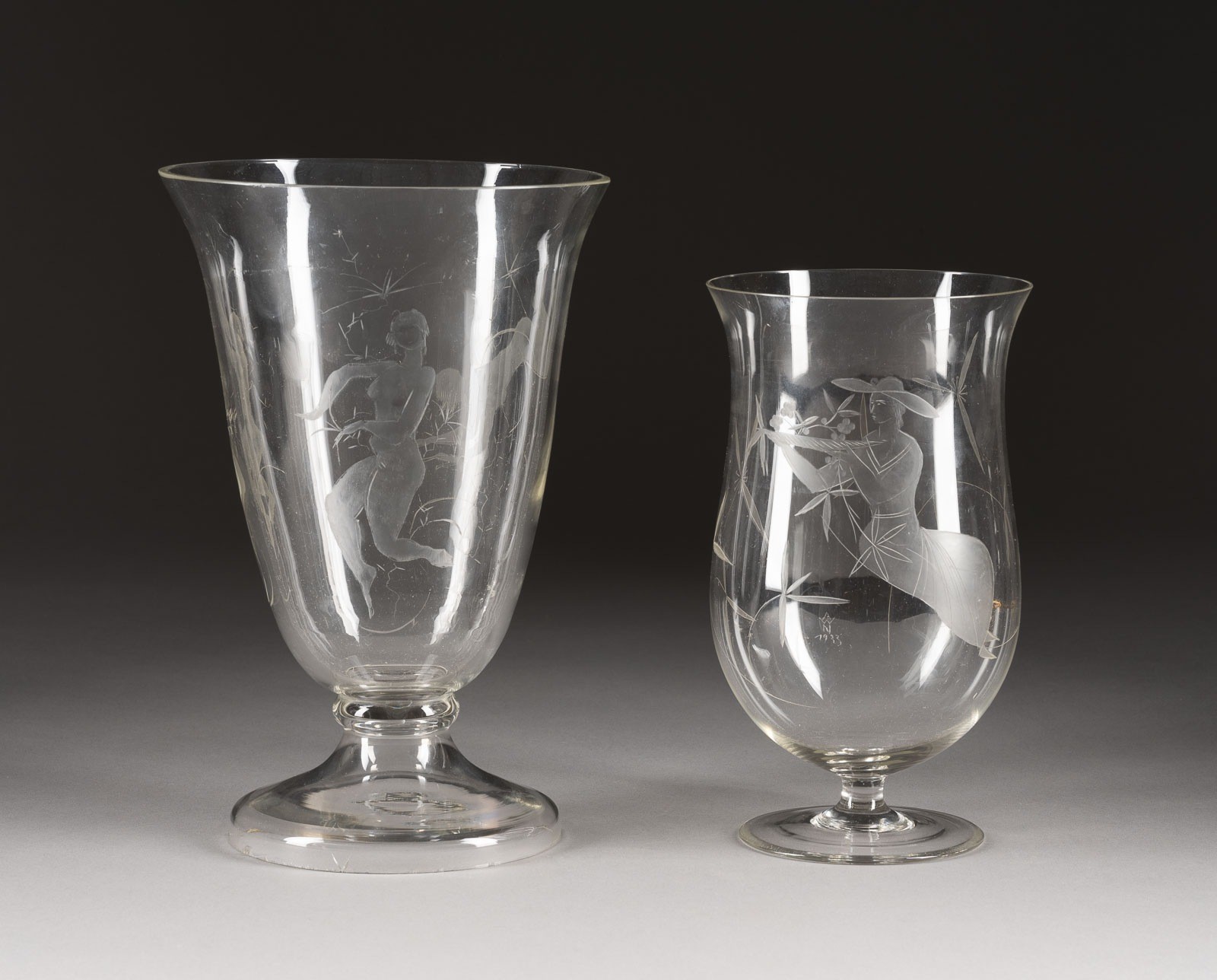 Farbloses Kristallglas, Gravurdekor. H. 21 und 25 cm. Einmal bez. 'AWN' mit Jahreszahl in Diamantriss. Vase 'Dame mit Blumen': auf Scheibenfuß und kurzem Schaft bauchige Vase, schauseitig
