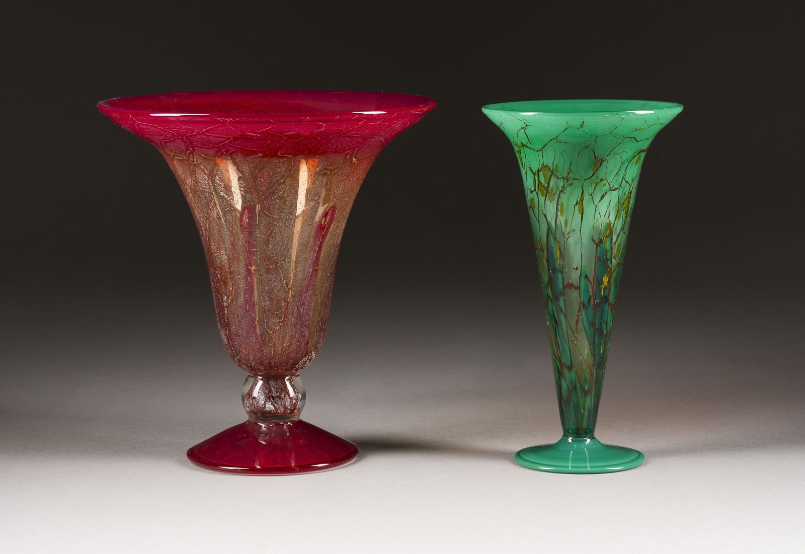 Farbloses Glas mit rotem/grünem Pulverinnenfang, schwarzer/goldener Fleckenstruktur. H. 21,5 cm.