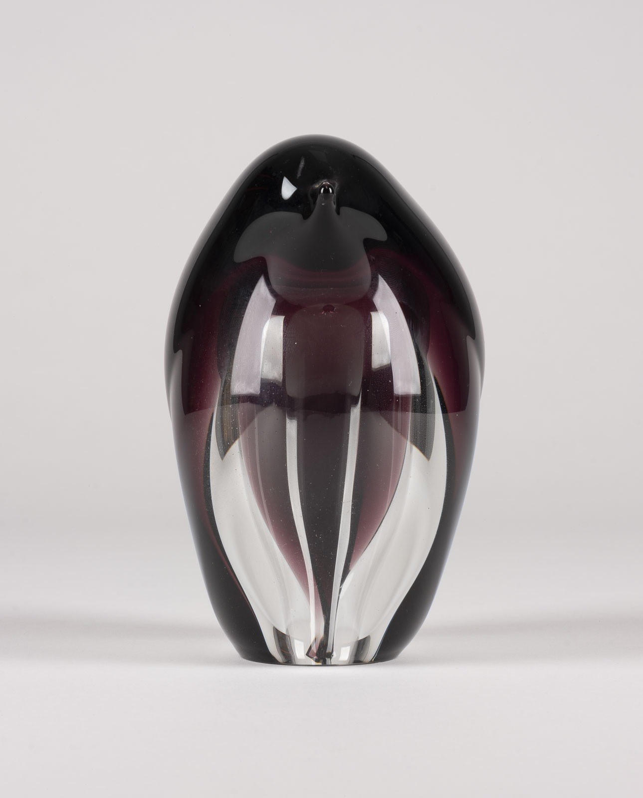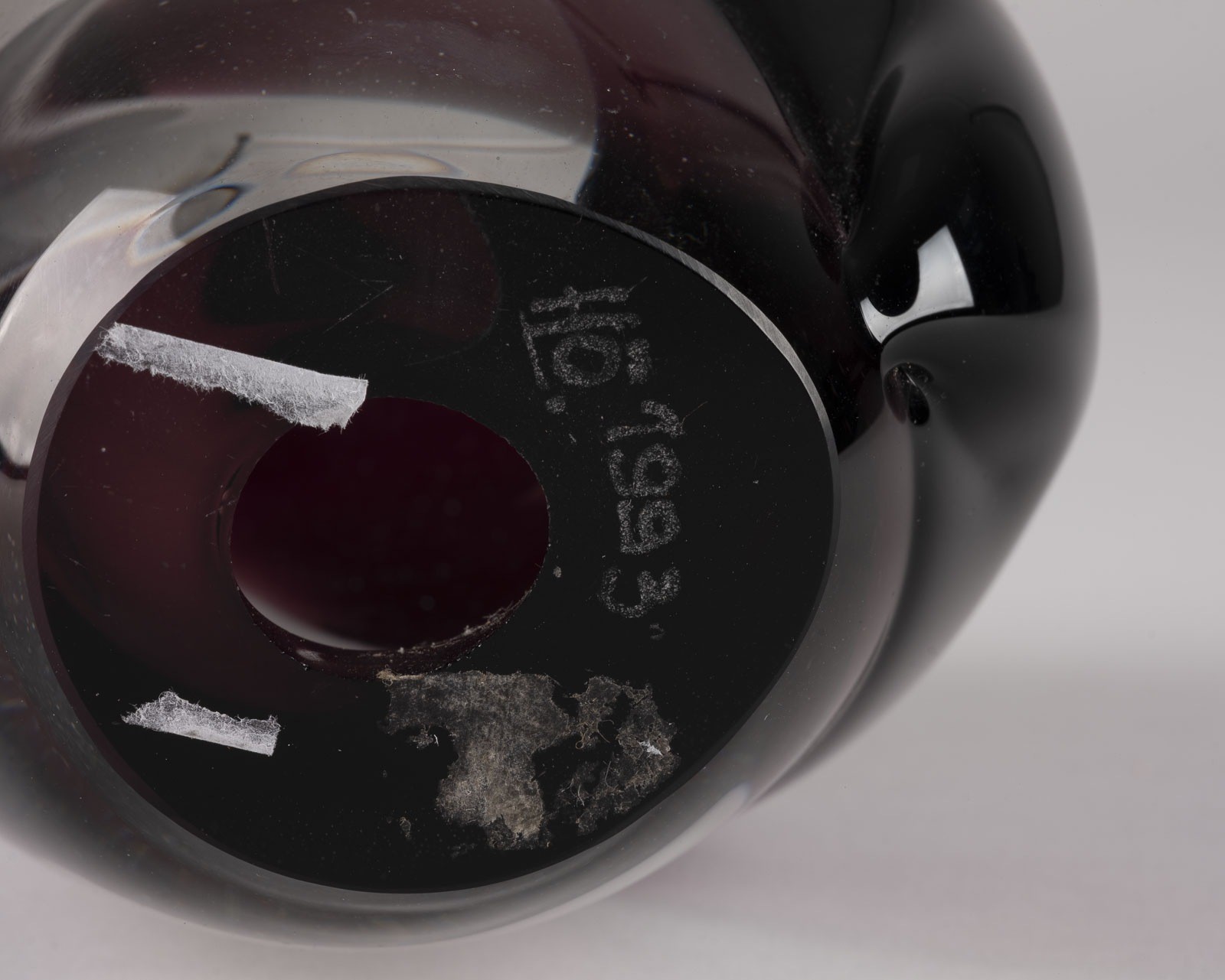 Dickwandiges, farbloses Glas, teilw. tief rot-violett überfangen. H. 16 cm, B. 12 cm, T. 9 cm. Unterseitig Ritzsignatur 'HLÖ 1993'.