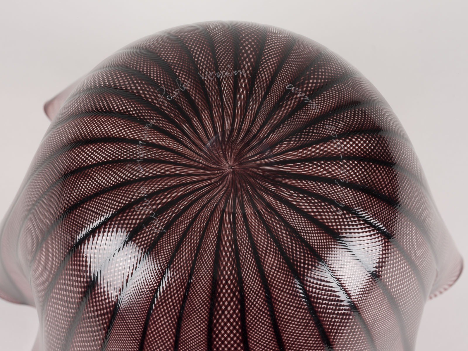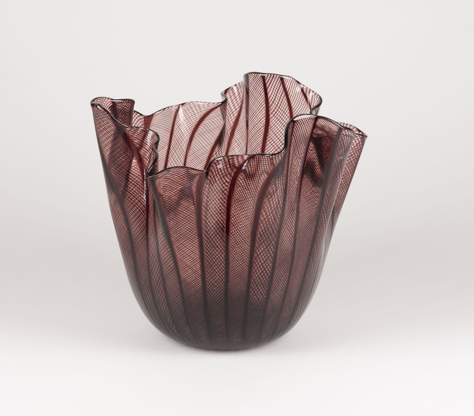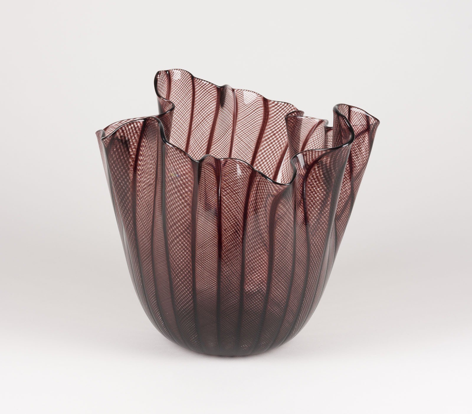 Glas farblos, eingeschmolzene schwarzviolette 'zanfirico' Glasstäbe, mehrfach gefaltete Wandung. H. max. 22,5 cm, D. ca. 25 cm. Unterseitig bez. 'Fulvio Bianconi' 'Paolo Venini' 'venini 2015 - 13/199' (geritzt).