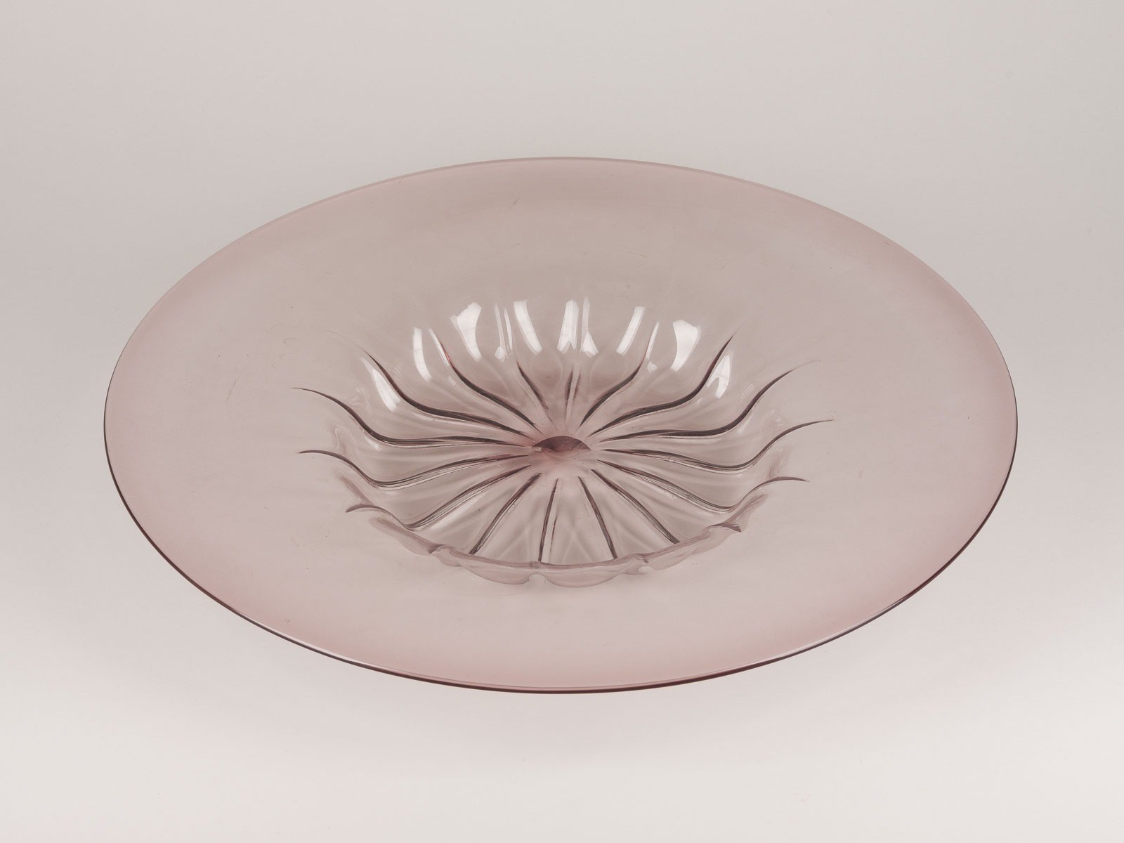 Zart amethystfarbenes Glas, rippig gemuldet m. breiter Fahne. H. 5 cm, D. 43,5 cm. Gebrauchsspuren, part. Kratzspuren.