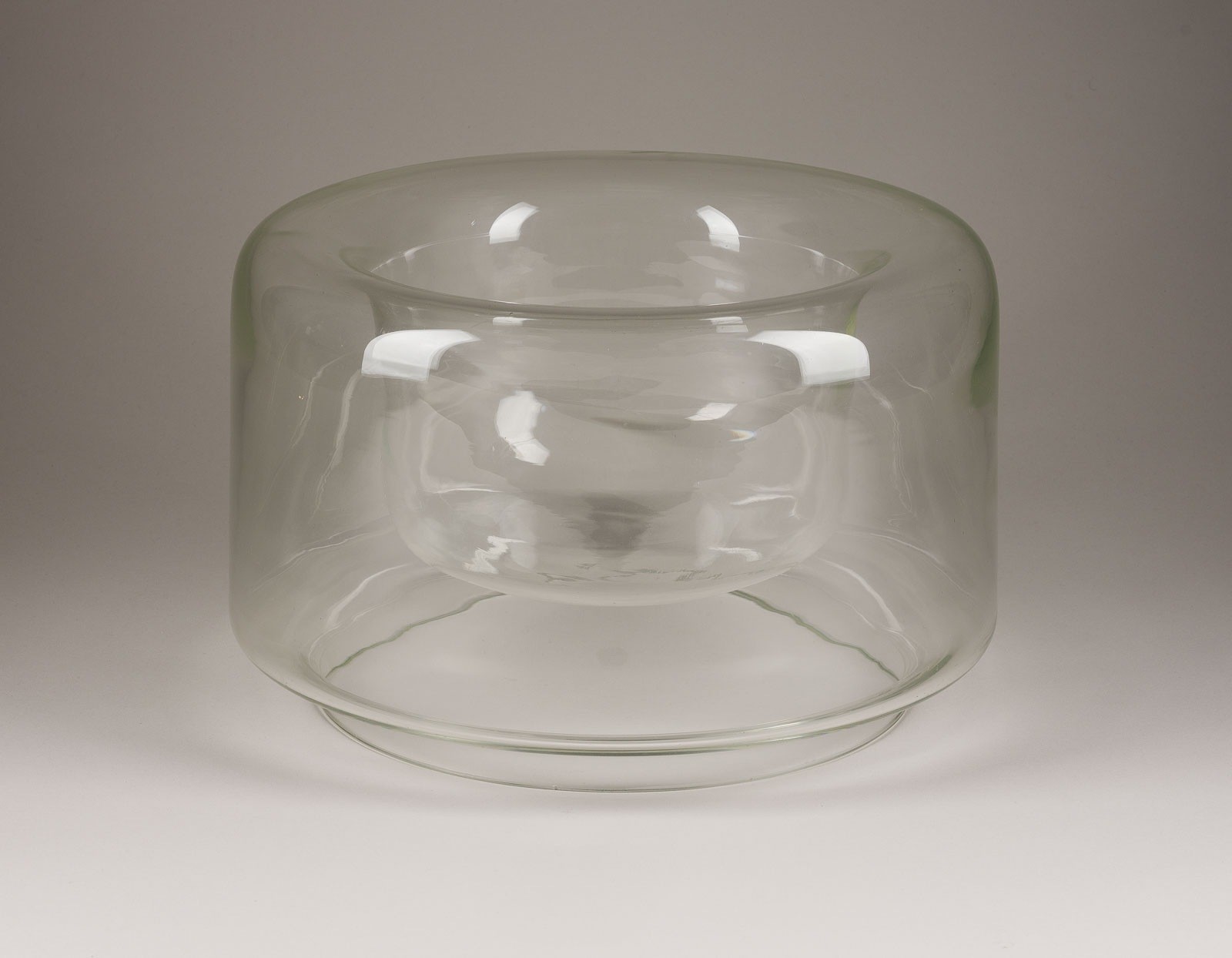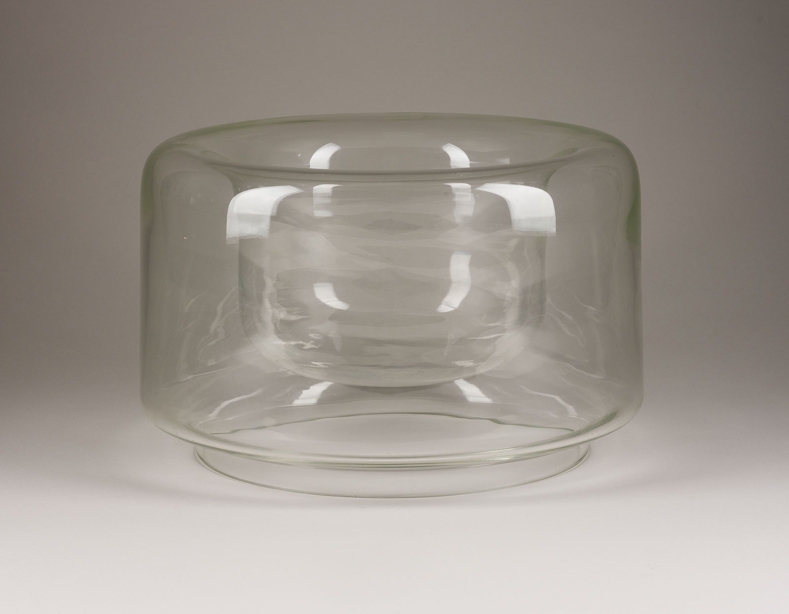 Glas farblos, modelgeblasen. H. 19 cm, D. 29 cm. Leichte Gebrauchsspuren.