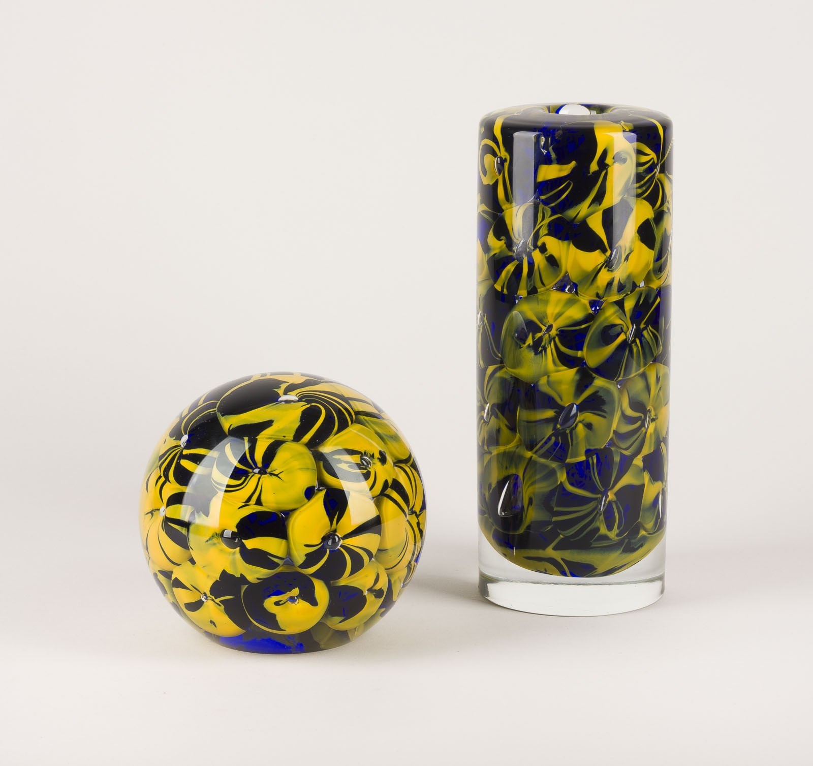 Opakes tiefblaues u. gelbes Glas, blütenartig, additiv verschmolzen, kräftig farblos überfangen, Stand poliert. H. 25,5 / 14 cm, D. 10 / 14 cm. Gebrauchsspuren, Kugel am Stand min. best..