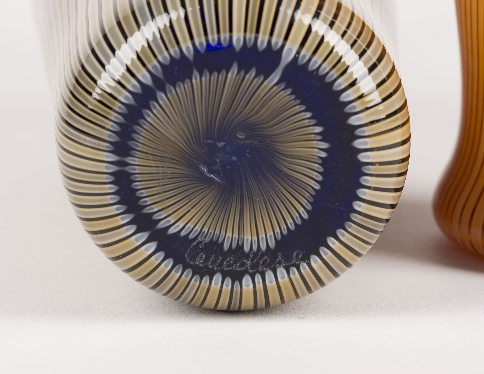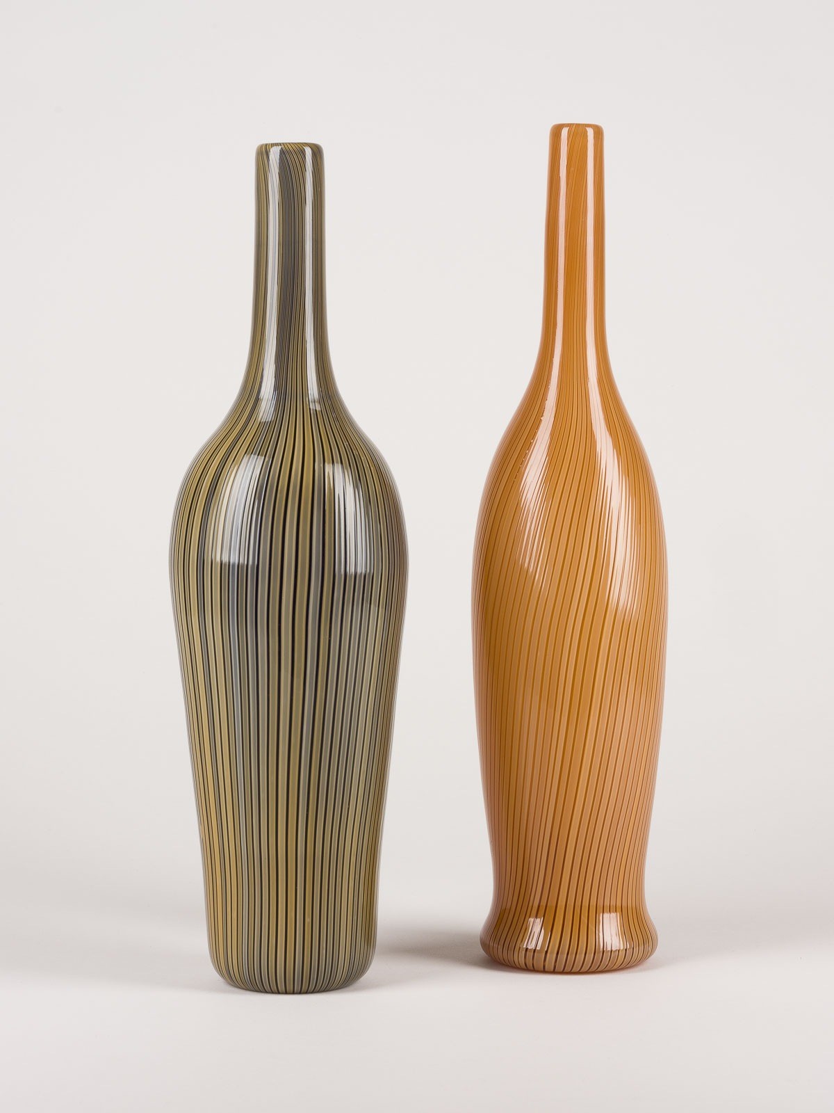 Glas, kobaltblau u. farblos, vertikal aufgeschmolzen, feines Fadendekor, grau, olivgrün bzw. rot-orange. H. 36 / 35 cm, D. max. 8,5 / 9,5 cm. Jew. bez. Etikett 'MURANO Cenedese VETRI', unterseitig 'Cendese' (geritzt).