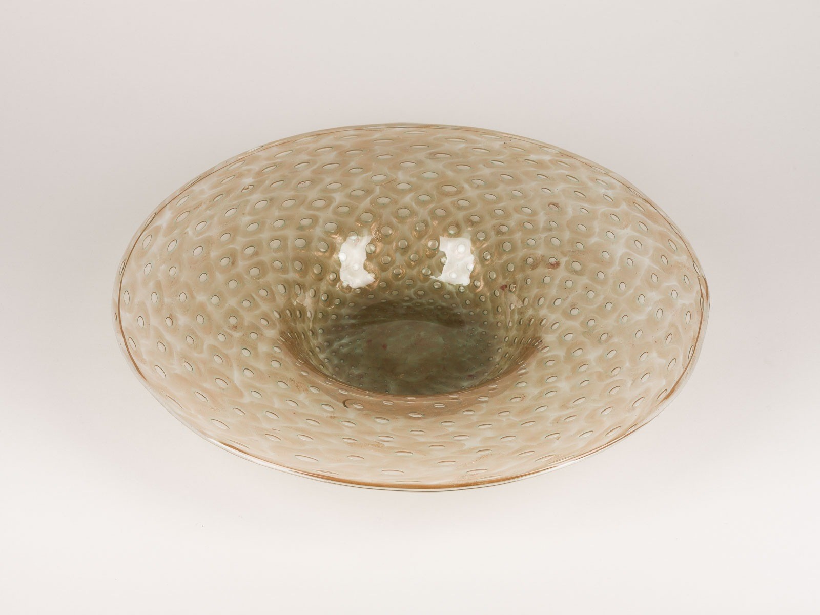 Überfangglas, farblos, Kupferaventurin u. Luftblasendekor 'a bolle' in der Zwischenschicht. H. 5 cm, D. 36 cm.