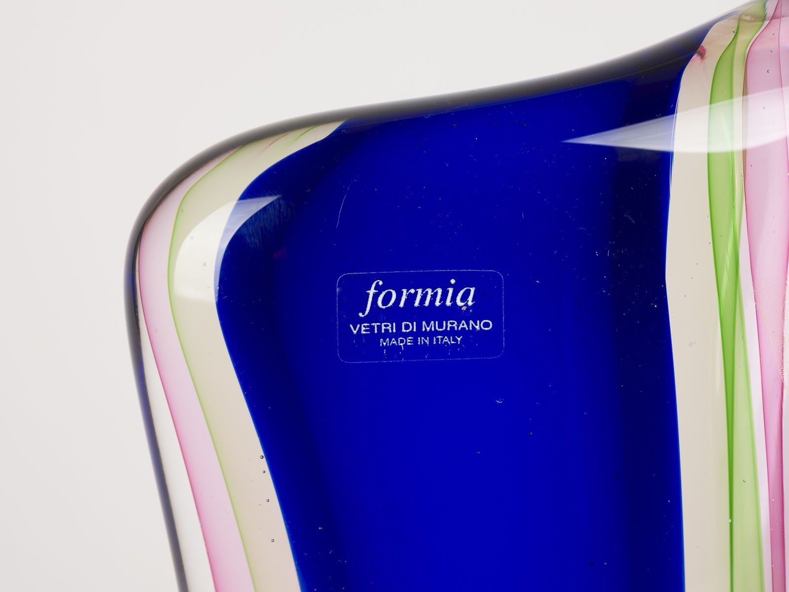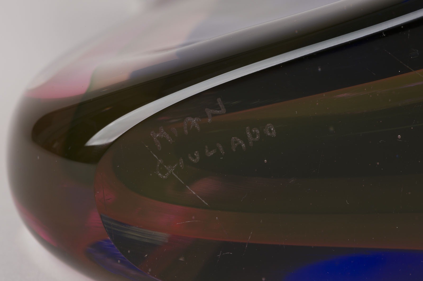 Kobaltblaues, rosa u. grünes Glas, farblos schwer überfangen, aufgelegte Goldfolie schauseitig. H. max. 32 cm, B. ca. 27 cm, T. ca. 11 cm. Unterseitig bez. 'Mian Giuliano' (geritzt).