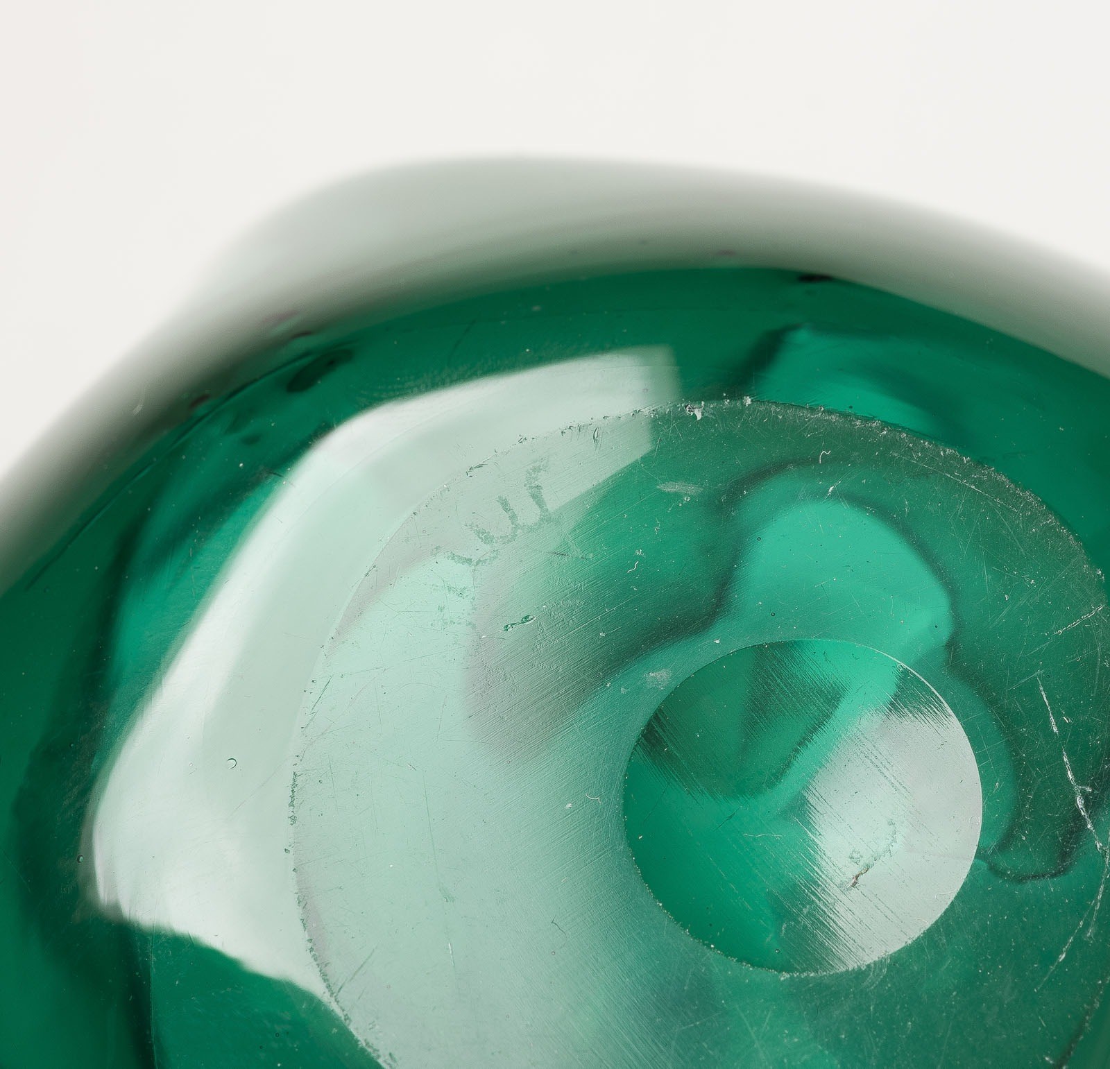 Glas, grün, Wandung mehrfach gefaltet. H. max. 12 cm, D. ca. 13 cm. Unterseitig schwach, runde Marke 'venini murano ITALY' (geätzt).