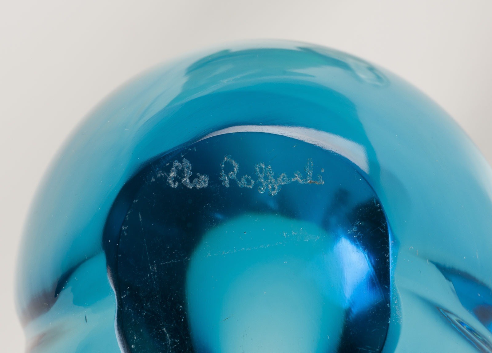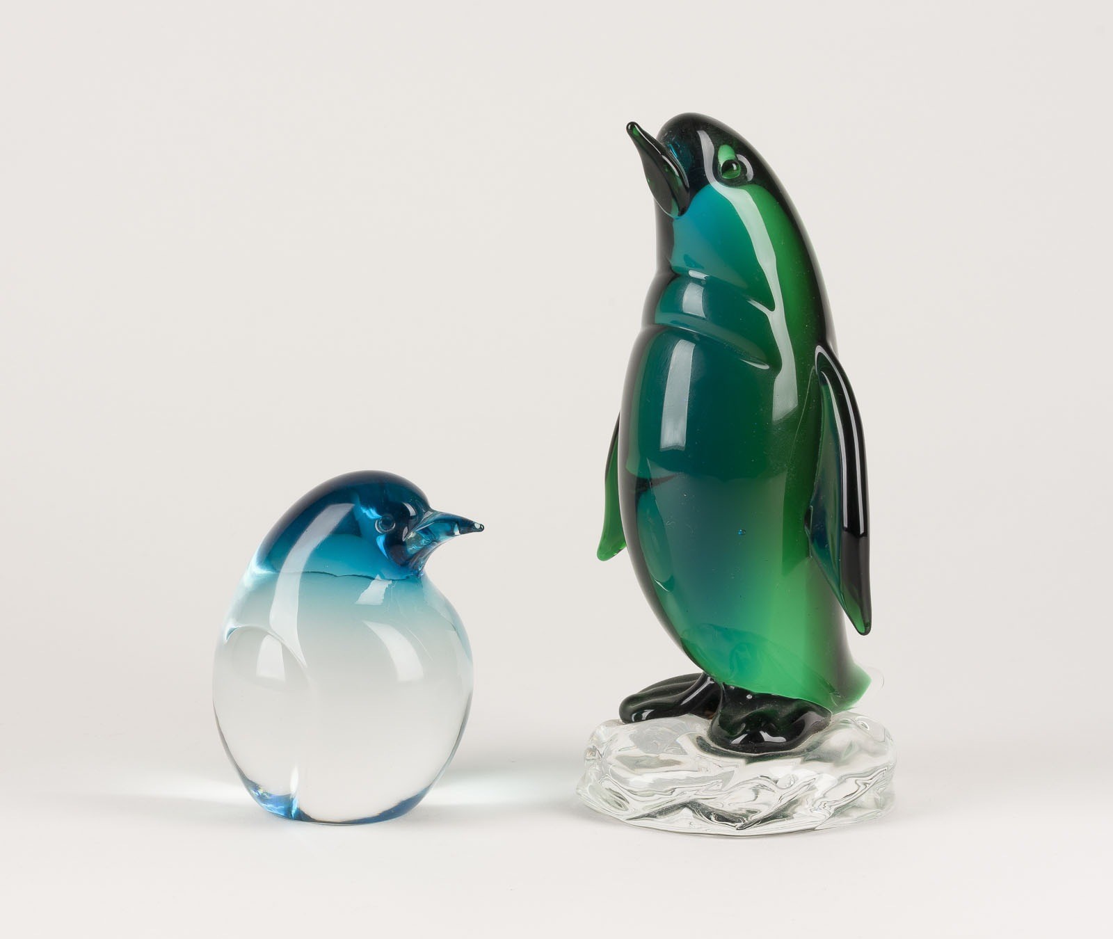 Aquamarinblaues Glas, farblos überfangen, frei geformt. H. 10 cm, D. max. 7 cm. Unterseitig signiert 'Elio Rafaeli' (geritzt). Blaues u. grünes Glas, farblos überfangen, frei geformt. H. 19,5 cm, D. max. ca. 10 cm.