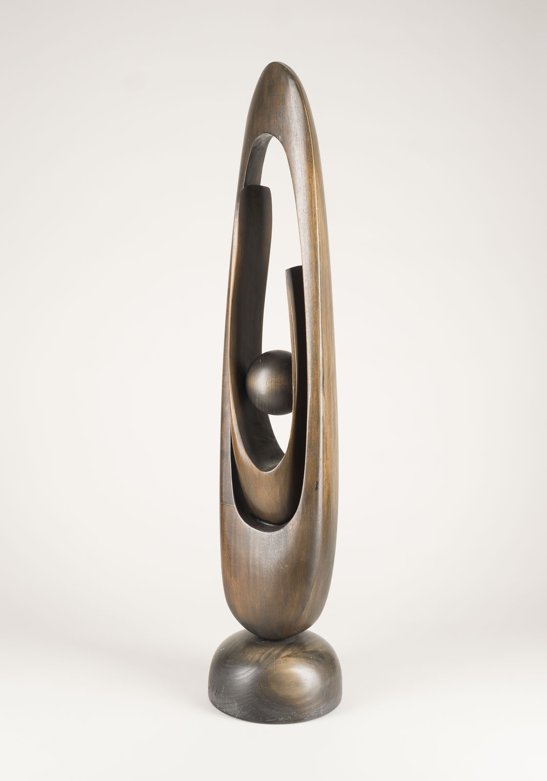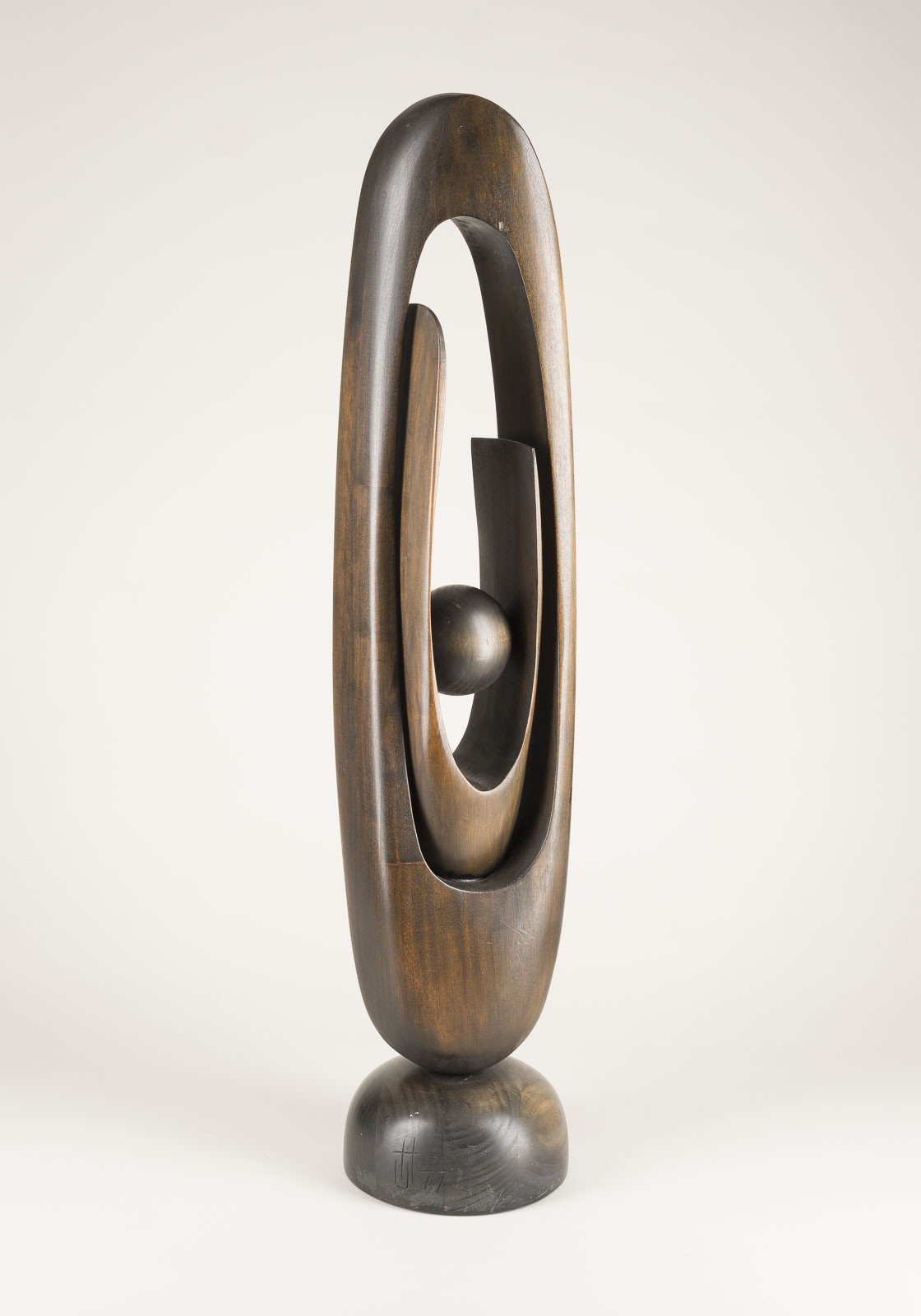 Holzskulptur, dunkelbraun lasiert. H. 97 cm, Gew. 6,7 kg. Rückseitig auf Sockel monogram. 'UH' und dat. '(19)77'. Part. best., part. mit Kratzspuren, part. min. verschm.