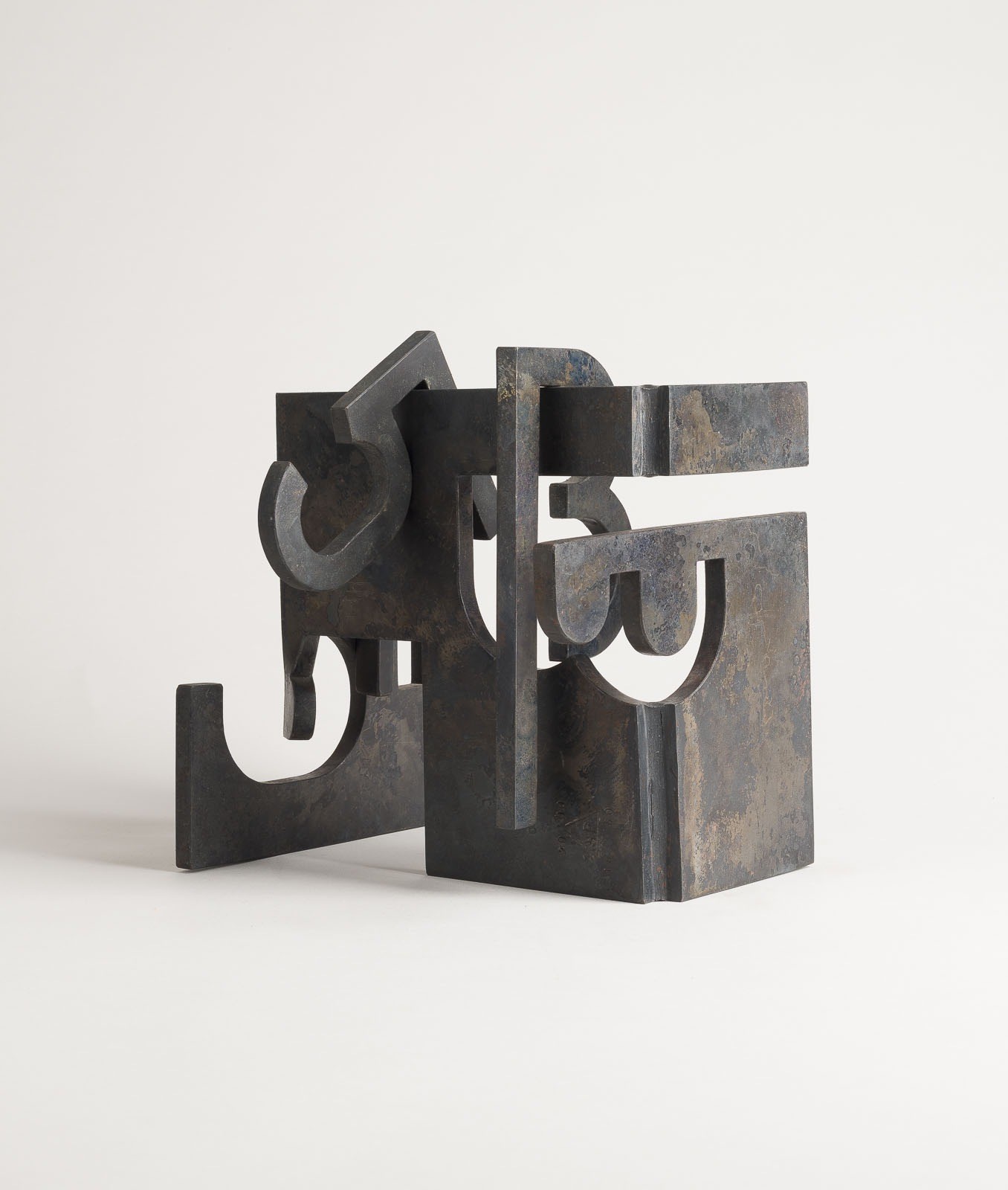 Gewalztes Stahlblech, doppelt gewinkelt, mit drei ausgestanzten Buchstaben/Zahlen, insgesamt 4 Teile. 19 x 20 x 16,5 cm, 5,1 kg. Rückseitig mit gestempeltem Künstlersignet, dat. sowie mit Ex.-Nr. '18/60'.